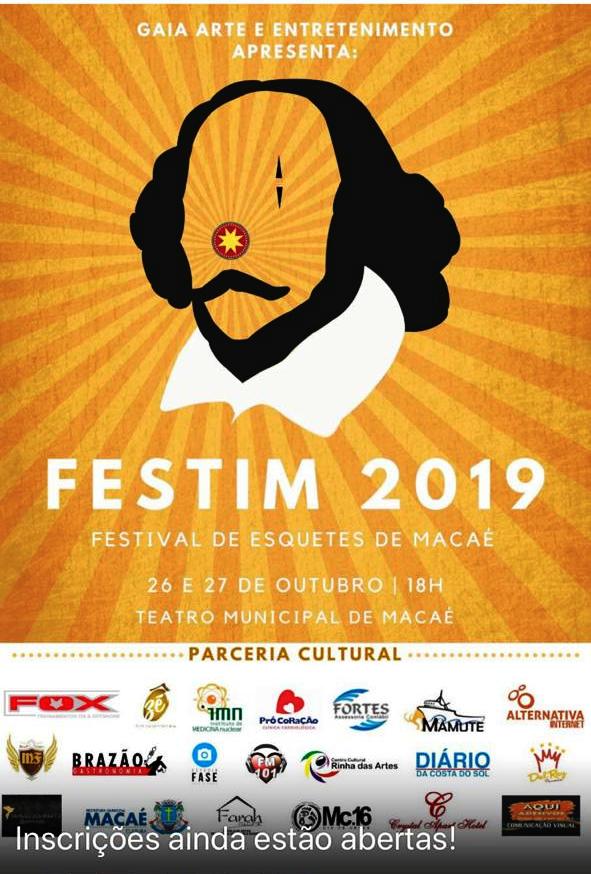 O Festim (Festival de Esquetes) de Macaé é um festival de esquetes/cenas curtas de teatro, numa mostra competitiva que premia grupos de todo o Brasil com prêmios em dinheiro, certificados e troféus. Serão R$ 2.500 em prêmios em dinheiro para os as três melhores esquetes, melhor direção, melhor ator, melhor atriz e melhor texto inédito. O Festim 2019 já está com bastante inscrições de grupos de teatro de toda região e até de outros estados. As inscrições ainda estão abertas. Para mais informações, visite o festim no instagram: @festimfestival e também no facebook e consultar o edital de inscrição.