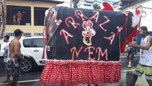 Crianças se divertiram, descendo as ruas do morro, acompanhando boneco da barreira e a vaquinha “Arrasa Nem”.