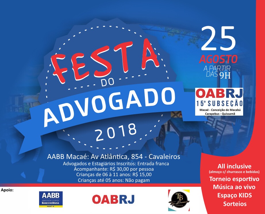 A 15ª Subseção Macaé da Ordem dos Advogados do Brasil terá uma programação especial alusiva ao Mês do Advogado com festa especial, que acontecerá neste sábado (25), a partir das 9h, na sede da AABB, localizada na orla da Praia Campista.