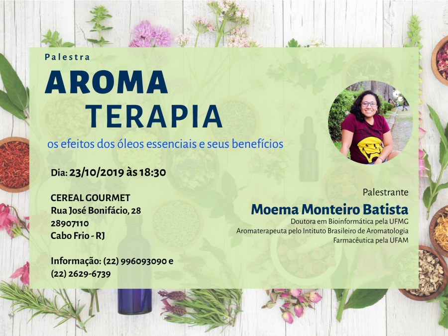 Para quem deseja conhecer um pouco mais do universo dos óleos essenciais, nesta quarta, 23 de outubro, às 18h30, a Dra Moema Monteiro Batista estará abordando o tema “Aromaterapia e Saúde”. A ideia é apresentar essa terapia reconhecida como prática integrativa e complementar pelo Ministério da Saúde, que trata problemas físicos e emocionais. A palestra acontecerá no Espaço de eventos do Cereall em Cabo Frio, que fica à Rua José Bonifácio, 28, no centro da cidade.