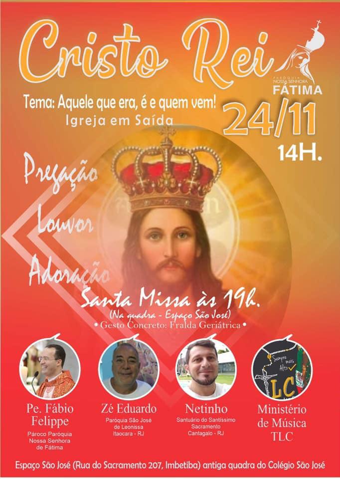 Com o objetivo de promover a evangelização e levar o amor de Deus aos corações, a Igreja Nossa Senhora de Fátima realizará a festa de Cristo Rei. O evento acontecerá neste domingo (24), a partir das 14h, na Rua do Sacramento, 207, Imbetiba, antiga quadra do Colégio São José, e terminará com a santa missa às 19h, a ser presidida pelo padre Fábio Felippe.