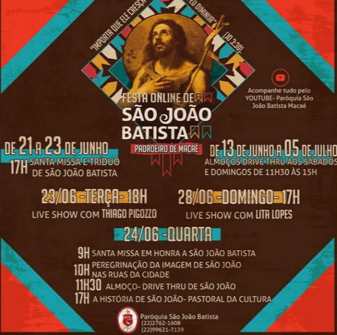 Na próxima quarta-feira (24), Macaé celebra o dia do padroeiro São João Batista. E as comemorações neste ano, em função da pandemia do novo coronavírus, estão diferentes. Toda programação está sendo online. Os fiéis podem assistir pela plataforma do Youtube Paróquia São João Batista de Macaé.