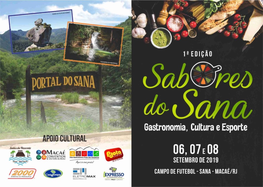 Um dos distritos da região serrana de Macaé mais frequentado por turistas, principalmente por aqueles que preferem lindas cachoeiras e a calmaria da serra. Além de possuir belezas naturais, o distrito do Sana, a partir de agora, irá oferecer excelente gastronomia. A partir desta sexta (06), acontece o Sabores do Sana: I Festival Gastronômico. O evento será realizado até o próximo domingo (08), com muita programação gastronômica, cultural, musical e esportiva, no Campo de Futebol.