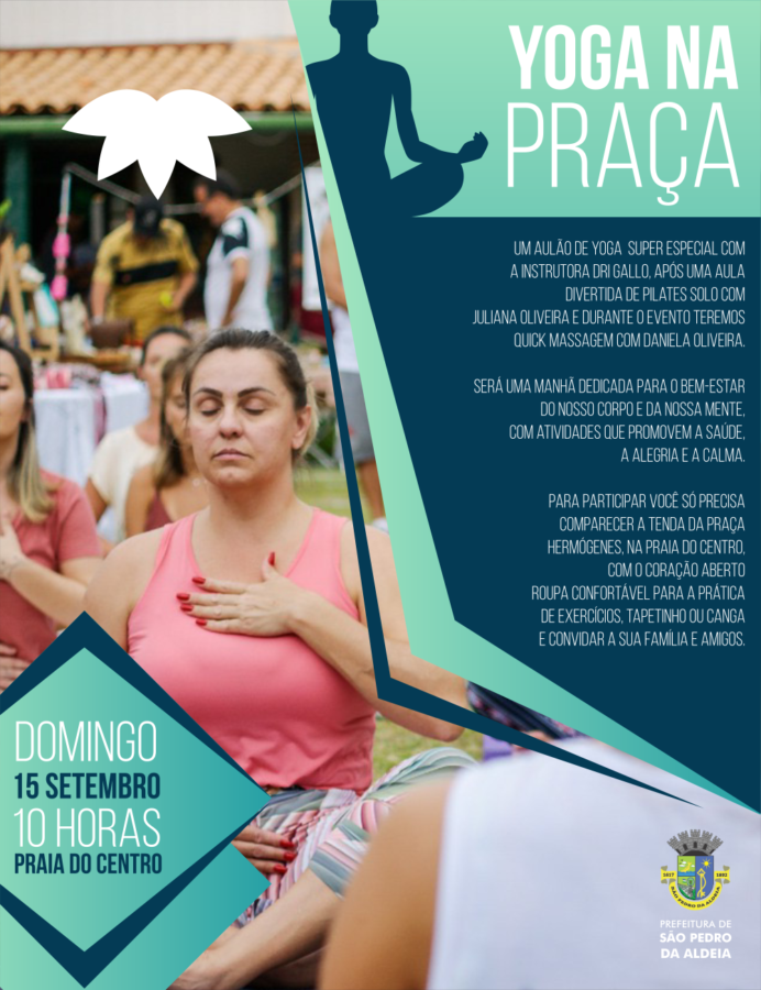 No próximo domingo (15), a Praça Hermógenes Freire da Costa, na Praia do Centro, em São Pedro da Aldeia, vai promover o "Yoga na Praça", um aulão de yoga, com a instrutora Dri Gallo, e de pilates solo, com Juliana Oliveira, a partir das 10h.