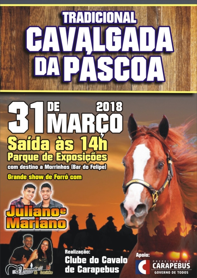 Para comemorar a Páscoa, o Clube de Cavalos de Carapebus, em parceria com a Prefeitura realiza neste sábado (31) , a partir das 14 horas, sua tradicional Cavalgada, saindo do Parque de Exposição em direção a Morrinhos. A estimativa, como a exemplo de outros anos, é a presença de centenas de cavaleiros e amazonas num evento que encanta a todos. A prefeitura, além do apoio logístico e de segurança promoverá o grande show artístico com as duplas de forró Juliano e Mariano e o par de vozes Marcinho e Luciana. A apresentação acontecerá no local da chegada da cavalgada.