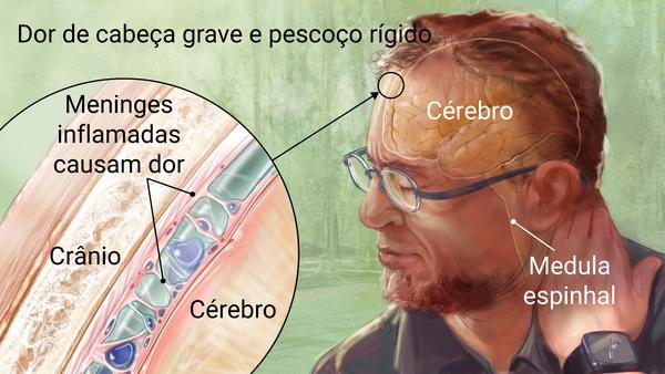 Em bebês, os sintomas são moleira tensa, agitação, choro intenso, rigidez do corpo e convulsões.