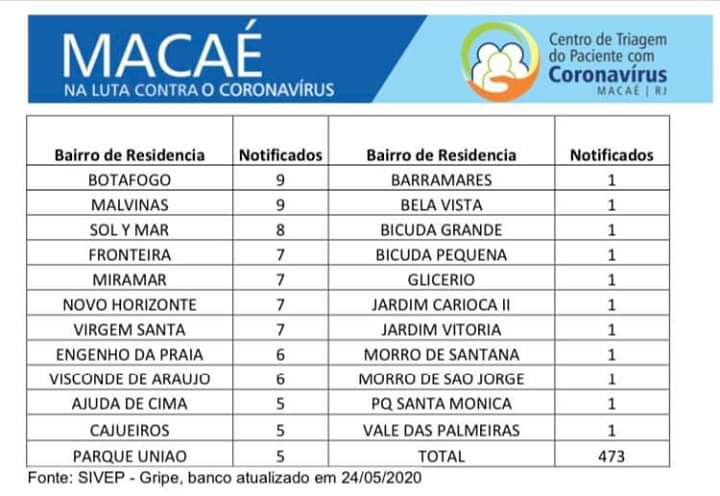 O documento foi baseado em informações do Sistema de Informações de Vigilância Epidemiológica (Sivep) e do Centro de Triagem do Paciente com Coronavírus (CTC), que funciona em Macaé desde o dia dia 18 de março - com atendimento 24 horas no antigo Centro de Saúde Dr. Jorge Caldas, no Centro.