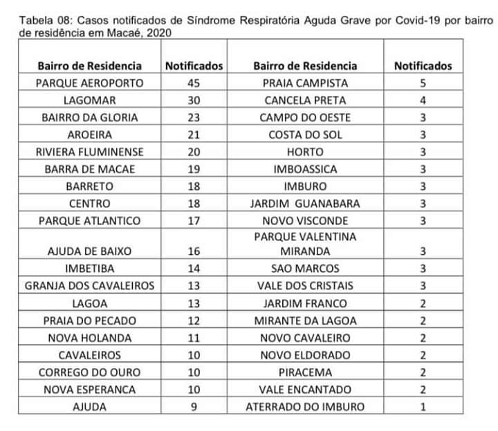 Os bairros com mais casos notificados de Covid-19 são Parque Aeroporto, Bairro da Glória, Lagomar, Aroeira e Riviera Fluminense. Quando é levada em consideração a taxa de incidência (cálculo entre o número de notificações e a população estimada do local), a ordem é: Barreto, Vale Encantado, Imboassica, Virgem Santa e Lagoa.