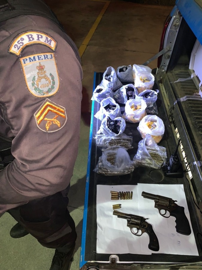 Em buscas no local, os militares encontraram dois revólveres calibre 38, 12 munições da mesma calibragem, 440 cápsulas de cocaína, 68 trouxinhas de maconha e um rádio transmissor. O material foi encaminhado para a 132ª Delegacia de Polícia (132ª DP) e apreendido. Ninguém foi preso.