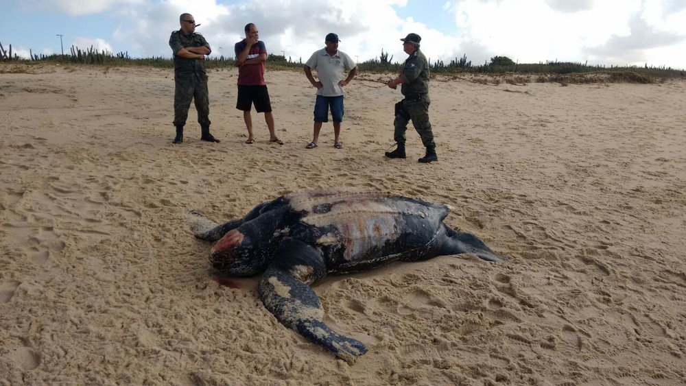 Uma tartaruga marinha adulta medindo quase dois metros foi encontrada morta na manhã desta quinta-feira (21), na Praia do Barreto, em Macaé. O animal, que pesa cerca de 450 kg, é da espécie tartaruga de couro (Dermochelys coriacea). De acordo com a Guarda Ambiental do município, ela pode ter engolido uma sacola plástica e ter se asfixiado.