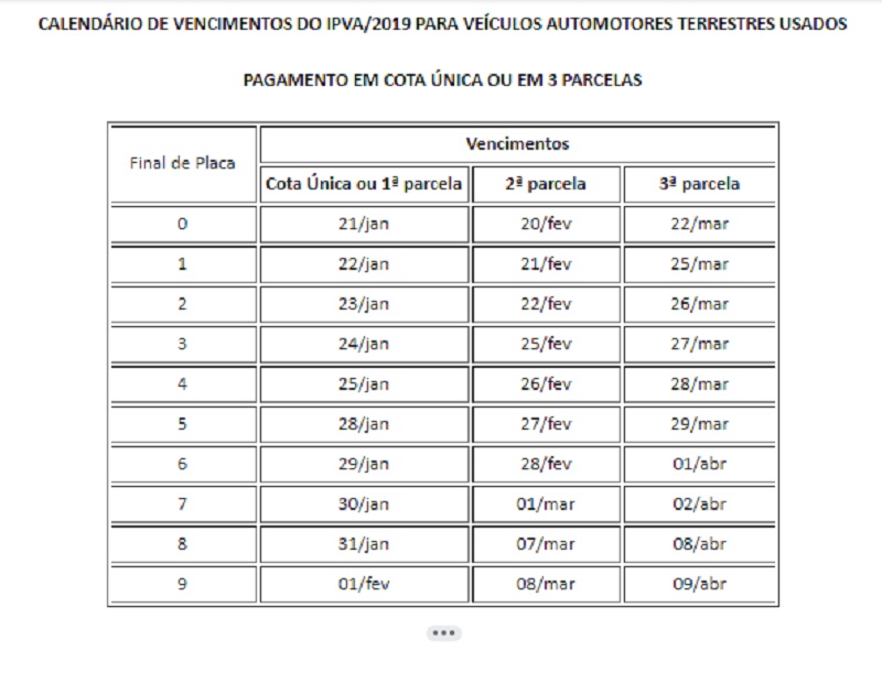O vencimento da cota única e da primeira parcela do imposto será no mesmo dia, a partir do dia 21 de janeiro, de acordo com o número do final da placa do automóvel. O IPVA 2019 deverá ser pago em cota única ou em três parcelas mensais e iguais. As tabelas de valores venais dos veículos serão publicadas em breve.
