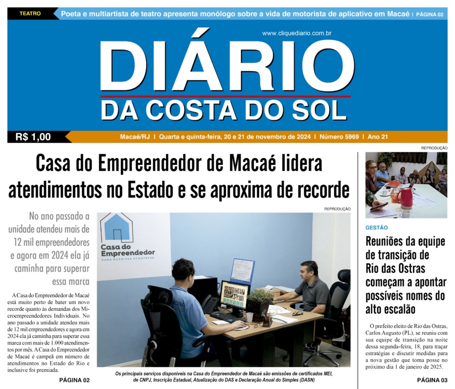 Edições Impressas Edição de quarta e quinta-feira 20 e 21/11/2024 nº 5969 Publicado em 20/11/2024 - 07:35 Escrito por Redação Notícias relacionadas: Seguinte Edição de sexta-feira 22/11/2024 nº 5970 Anterior Edição de terça-feira 19/11/2024 nº 5968 Redação Notícias Recentes Cabo Frio9 horas atrás Reforma marca nova fase para o esporte cabo-friense e aniversário da cidade Arraial do cabo9 horas atrás Fórum de Arraial propõe novo modelo de desenvolvimento baseado nos 3Ds; Desvincular, Descarbonizar e Descontaminar Saúde9 horas atrás Saúde de Rio das Ostras promove mutirão de cirurgia pediátrica nessa semana Cidades9 horas atrás Guarda Ambiental resgata jiboia de três metros em área urbana de Macaé Cidades10 horas atrás Vereadores de Macaé vão embarcar nesta quinta para participar da COP 30 em Belém Arraial do cabo10 horas atrás Parceria com a PF fortalece preparo técnico da Segurança Pública de Arraial do Cabo Arraial do cabo10 horas atrás Iniciativa busca compensar emissões de carbono da frota de Arraial Cidades11 horas atrás Parceria com o Estado reforça prevenção de enchentes em Rio das Ostras há 39 dias do verão Desenvolvimento11 horas atrás Arteris vence novo leilão da BR-101 e mantém operação da via até 2047 Cidades11 horas atrás Prefeitura de Quissamã abre prazo para solicitação de isenção do IPTU 2026 e 2027 Clique Diário E. L. Mídia Editora Ltda CNPJ: 09.298.880/0001-07 Redação: Rua Tupinambás 122 Gloria – Macaé/RJ comercial@diariocs.com (22) 2765-7353 (22) 999253130 Mais lidas da semana Arraial do cabo7 dias atrás Arraial do Cabo celebra 3ª edição do Festival de Frutos do Mar com entrada livre; Carol Biazin, Ramona Rox, Liah Soares e mais Meio Ambiente6 dias atrás Ações do Programa Limpa Rio seguem em vários pontos de Rio das Ostras Cabo Frio7 dias atrás Música, poesia e memória celebram os 410 anos de Cabo Frio Polícia16 horas atrás Farmácia é interditada e uma pessoa é presa em Rio das Ostras em operação da Polícia Federal