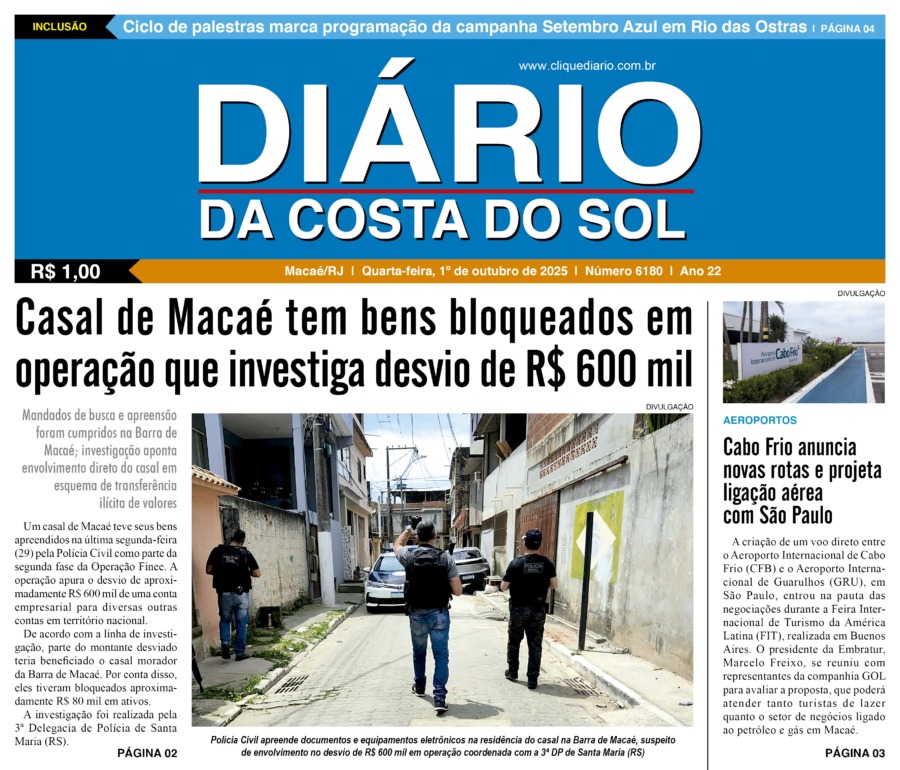 Edições Impressas Edição de quarta-feira 01/10/2025 nº 6180 Publicado em 01/10/2025 - 08:05 Escrito por Redação Notícias relacionadas: Seguinte Edição de quinta-feira 02/10/2025 nº 6181 Anterior Edição de terça-feira 30/09/2025 nº 6179 Redação Notícias Recentes Cabo Frio7 horas atrás Cabo Frio promove ação do projeto Capoeiragem para registro de documentário Sem categoria9 horas atrás Cabo Frio recebe iniciativa que vai orientar Política Estadual do Empreendedorismo Edições Impressas14 horas atrás Edição de quinta e sexta-feira 20 e 21/11/2025 nº 6216 Armação dos Búzios1 dia atrás Búzios atinge 80% de ocupação no feriado Cabo Frio1 dia atrás Cabo Frio prepara esquema especial de segurança nas praias e áreas de lazer Cabo Frio1 dia atrás Cabo Frio realiza ações de proteção a fauna após aparecimento de animais em bairros Cabo Frio1 dia atrás Cabo Frio reúne especialistas em evento do programa “Vim Cuidar de Você” Desenvolvimento1 dia atrás Rio das Ostras estreita relações com a Rede Petro BC de olho em eventos do setor de energia em 2026 Cabo Frio1 dia atrás Aula-passeio apresenta riqueza cultural e ambiental de Cabo Frio na Fazenda Campos Novos Cabo Frio1 dia atrás Cabo Frio suspende expediente em órgãos públicos nesta sexta Clique Diário E. L. Mídia Editora Ltda CNPJ: 09.298.880/0001-07 Redação: Rua Tupinambás 122 Gloria – Macaé/RJ comercial@diariocs.com (22) 2765-7353 (22) 999253130 Mais lidas da semana Cultura6 dias atrás Adilson Lopes apresenta exposição “Trajetória” em Casimiro de Abreu Cabo Frio7 horas atrás Cabo Frio promove ação do projeto Capoeiragem para registro de documentário Desenvolvimento1 dia atrás Rio das Ostras estreita relações com a Rede Petro BC de olho em eventos do setor de energia em 2026 Cultura1 dia atrás Moda e Prosa Caipira tem sua 6ª edição nessa quinta, 20, em Saquarema