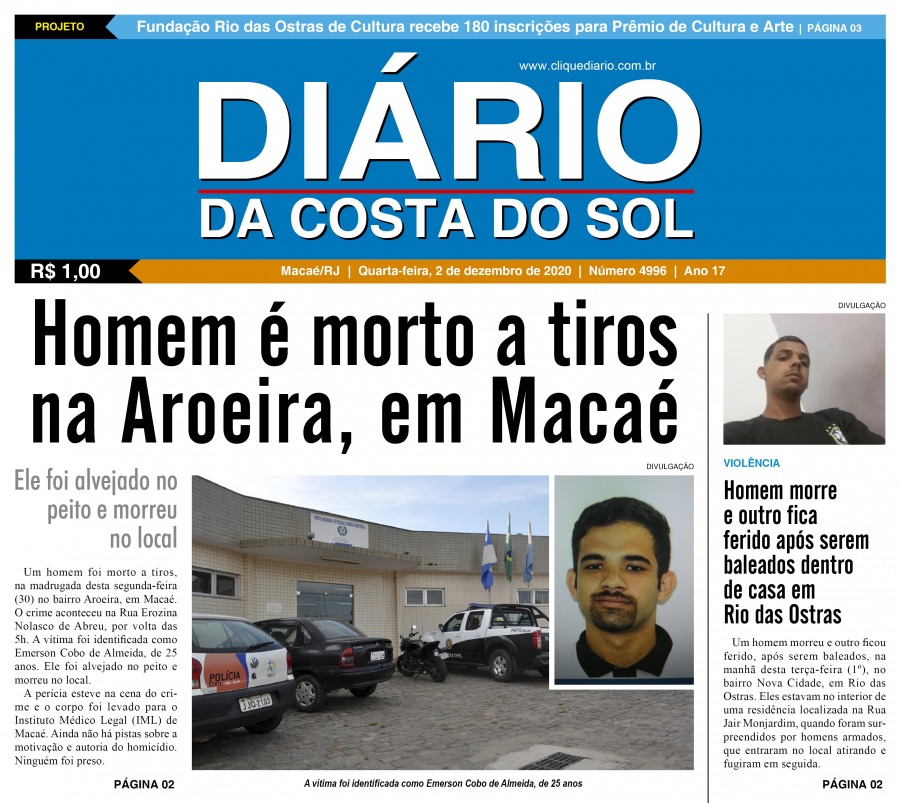 Edições Impressas Edição de quarta-feira 02/12/2020 nº 4996 Publicado em 02/12/2020 - 04:50 Escrito por Fernando Vitor Notícias relacionadas:destaque Seguinte Edição de quinta-feira 03/12/2020 nº 4997 Anterior Edição de terça-feira 01/12/2020 nº 4995 Fernando Vitor Notícias Recentes Cabo Frio16 horas atrás Estudantes de Cabo Frio brilham em premiação do projeto CaptaAção Armação dos Búzios21 horas atrás Búzios Swim celebra esporte, natureza e turismo na Região dos Lagos Cabo Frio22 horas atrás Educação pública de Cabo Frio colhe frutos com conquistas em competições científicas Edições Impressas22 horas atrás Edição de sábado a segunda-feira 08 a 10/11/2025 nº 6208 Polícia22 horas atrás Moto sem placa é abandonada após fuga de suspeito em Macaé Polícia23 horas atrás Polícia Civil prende homem em flagrante por tráfico de drogas no Parque Aeroporto, em Macaé Iguaba2 dias atrás Menina de Iguaba Grande realiza sonho e conhece o príncipe William no Rio de Janeiro Arraial do cabo2 dias atrás Arraial do Cabo é exemplo de tranquilidade na Região dos Lagos, segundo dados do ISP Arraial do cabo2 dias atrás Festival em Arraial do Cabo promete recorde de público com mais de 15 mil pratos e 10 mil litros de chope Arraial do cabo2 dias atrás Oficina une saúde, cidadania e acolhimento em Arraial do Cabo Clique Diário E. L. Mídia Editora Ltda CNPJ: 09.298.880/0001-07 Redação: Rua Tupinambás 122 Gloria – Macaé/RJ comercial@diariocs.com (22) 2765-7353 (22) 999253130 Mais lidas da semana Arraial do cabo3 dias atrás Arraial do Cabo celebra 3ª edição do Festival de Frutos do Mar com entrada livre; Carol Biazin, Ramona Rox, Liah Soares e mais Turismo6 dias atrás Saquarema celebra reconhecimento de projeto pelo Ministério do Turismo Educação5 dias atrás Estudantes de Rio das Ostras são destaques em evento nacional da Educação Cidades5 dias atrás HFM ganha novo Pronto-Socorro moderno e ampliado em Campos