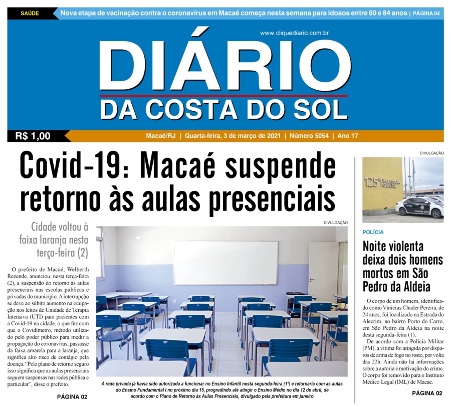 Edições Impressas Edição de quarta-feira 03/03/2021 nº 5054 Publicado em 03/03/2021 - 04:43 Escrito por Fernando Vitor Notícias relacionadas:destaque Seguinte Edição de quinta-feira 04 /03/2021 nº 5055 Anterior Edição de terça-feira 02/03/2021 nº 5053 Fernando Vitor Notícias Recentes Cabo Frio1 hora atrás Reforma marca nova fase para o esporte cabo-friense e aniversário da cidade Arraial do cabo1 hora atrás Fórum de Arraial propõe novo modelo de desenvolvimento baseado nos 3Ds; Desvincular, Descarbonizar e Descontaminar Saúde2 horas atrás Saúde de Rio das Ostras promove mutirão de cirurgia pediátrica nessa semana Cidades2 horas atrás Guarda Ambiental resgata jiboia de três metros em área urbana de Macaé Cidades2 horas atrás Vereadores de Macaé vão embarcar nesta quinta para participar da COP 30 em Belém Arraial do cabo2 horas atrás Parceria com a PF fortalece preparo técnico da Segurança Pública de Arraial do Cabo Arraial do cabo2 horas atrás Iniciativa busca compensar emissões de carbono da frota de Arraial Cidades3 horas atrás Parceria com o Estado reforça prevenção de enchentes em Rio das Ostras há 39 dias do verão Desenvolvimento4 horas atrás Arteris vence novo leilão da BR-101 e mantém operação da via até 2047 Cidades4 horas atrás Prefeitura de Quissamã abre prazo para solicitação de isenção do IPTU 2026 e 2027 Clique Diário E. L. Mídia Editora Ltda CNPJ: 09.298.880/0001-07 Redação: Rua Tupinambás 122 Gloria – Macaé/RJ comercial@diariocs.com (22) 2765-7353 (22) 999253130 Mais lidas da semana Arraial do cabo6 dias atrás Arraial do Cabo celebra 3ª edição do Festival de Frutos do Mar com entrada livre; Carol Biazin, Ramona Rox, Liah Soares e mais Meio Ambiente6 dias atrás Ações do Programa Limpa Rio seguem em vários pontos de Rio das Ostras Cidades6 dias atrás Quissamã participa do lançamento do Programa Ambiente Resiliente, do Governo do Estado Cidades1 dia atrás Servidores de Rio das Ostras participam de treinamento do Estado em Búzios