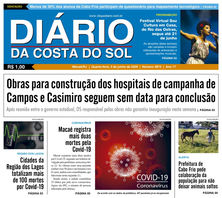 Edições Impressas Edição de quarta-feira, 03/06/2020 nº 4873 Publicado em 03/06/2020 - 05:00 Escrito por Fernando Vitor Notícias relacionadas: Seguinte Edição de quinta-feira 04/06/2020 nº 4874 Anterior Edição de terça-feira 02/06/2020 nº 4872 Fernando Vitor Notícias Recentes Cidades1 hora atrás Macaé realizou 5ª Corrida e Caminhada Outubro Rosa Novembro Azul na orla da Imbetiba Cidades1 hora atrás Rio das Ostras autua Rio+ por mais um caso de vazamento de esgoto na cidade Cabo Frio1 hora atrás Ação da Prefeitura e AAMA leva reflexão sobre autocuidado e prevenção do câncer de mama em Cabo Frio Cidades1 hora atrás Casa do Servidor em Macaé ultrapassa 7 mil atendimentos em oito meses de funcionamento Polícia1 hora atrás Foragido da Justiça é preso pela PM na BR-101 em Campos Araruama2 horas atrás Prefeitura define plano de segurança integrado para a Expo Araruama Iguaba2 horas atrás Prefeitura de Iguaba Grande prepara nova turma de aprendizes para atuação em órgãos públicos Cabo Frio2 horas atrás Mostra de Dança movimenta Cabo Frio com apresentações, solidariedade e cultura local Cabo Frio2 horas atrás Cabo Frio dá início à formação obrigatória para ambulantes das praias Polícia2 horas atrás Homem é preso com rádios transmissores em depósito de Casimiro de Abreu Clique Diário E. L. Mídia Editora Ltda CNPJ: 09.298.880/0001-07 Redação: Rua Tupinambás 122 Gloria – Macaé/RJ comercial@diariocs.com (22) 2765-7353 (22) 999253130 Mais lidas da semana Cultura6 dias atrás Música, emoção e cores: Rodrigo Pontes apresenta show especial em Rio das Ostras Edições Impressas5 dias atrás Edição de quarta-feira 22/10/2025 nº 6195 Edições Impressas4 dias atrás Edição de quinta-feira 23/10/2025 nº 6196 Cidadania3 dias atrás Plano Diretor de Rio das Ostras é tema de fórum da sociedade civil nesse sábado, 25