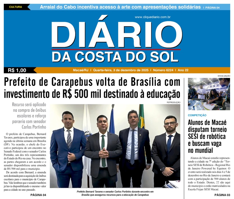 Edições Impressas Edição de quarta-feira 03/12/2025 nº 6224 Publicado em 03/12/2025 - 08:34 Escrito por Redação Notícias relacionadas: Anterior Edição de terça-feira 02/12/2025 nº 6223 Redação Notícias Recentes Edições Impressas14 segundos atrás Edição de quarta-feira 03/12/2025 nº 6224 Arraial do cabo16 horas atrás Arraial do Cabo incentiva acesso à arte com apresentações solidárias Cabo Frio16 horas atrás Cabo Frio reforça capacitação em primeiros socorros para equipes de rua Cabo Frio16 horas atrás Cabo Frio recebe evento técnico voltado ao setor contábil Cabo Frio16 horas atrás Cabo Frio leva blitz educativa a Tamoios para reforçar rede de proteção Cidades18 horas atrás Alunos de Macaé participam do Torneio SESI de Robótica e concorrem a vaga no mundial Cidades18 horas atrás Rio das Ostras divulga calendário escolar de 2026; aulas começam em 4 de fevereiro Cidades19 horas atrás Rio das Ostras recebe ação para emissão de carteirinhas do Sesc nos dias 3, 4 e 5 de dezembro Cabo Frio20 horas atrás Cabo Frio prepara cerimônias de hasteamento da Bandeira Azul Cidades22 horas atrás Bernard Tavares conquista nova emenda de R$ 500 mil durante agenda em Brasília Clique Diário E. L. Mídia Editora Ltda CNPJ: 09.298.880/0001-07 Redação: Rua Tupinambás 122 Gloria – Macaé/RJ comercial@diariocs.com (22) 2765-7353 (22) 999253130 Mais lidas da semana Cidades5 dias atrás Macaé abre programação do Natal Magia com grande público na Praia Campista Cidades5 dias atrás Moradora de Rio das Ostras é destaque de programa de TV de Cissa Guimarães Cultura7 dias atrás Sindicomércio anuncia Sesc Verão 2026 em Rio das Ostras e Casimiro de Abreu Política7 dias atrás Rio das Ostras entrega honraria para secretária estadual de Cultura e Economia Criativa