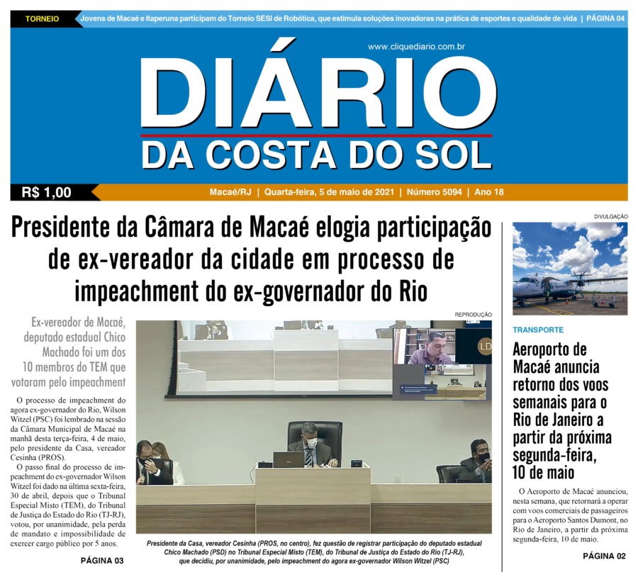 Edições Impressas Edição de quarta-feira 05/05/2021 nº 5094 Publicado em 05/05/2021 - 00:00 Escrito por Fernando Vitor Notícias relacionadas:destaque Seguinte Edição de quinta-feira 06/05/2021 nº 5095 Anterior Edição de terça-feira 04/05/2021 nº 5093 Fernando Vitor Notícias Recentes Cidades15 horas atrás Macaé discute armamento da Guarda Municipal como parte de ações para fortalecer a segurança pública Araruama15 horas atrás Presos em Araruama tinham mandados por roubo e associação criminosa Educação15 horas atrás Inscrição para vagas nas creches de Rio das Ostras em 2026 termina nessa sexta, 14 Cabo Frio15 horas atrás Cabo Frio executa nova etapa de sinalização horizontal na cidade Cidades15 horas atrás Agricultores e pecuaristas de Quissamã participam de encontro de capacitação e orientação técnica Arraial do cabo15 horas atrás Nova licença digital promete mais agilidade e transparência em Arraial do Cabo Polícia16 horas atrás Idoso é assassinado a tiros às margens da BR-101, em Campos Esporte16 horas atrás Atletas de Rio das Ostras e Saquarema conquistam título de brasileiro de bodyboarding Arraial do cabo16 horas atrás Sucesso de vendas faz pratos especiais continuarem até o fim de novembro em Arraial no Festival de Frutos do Mar Cabo Frio16 horas atrás Iniciativa reforça compromisso com a identidade cultural cabo-friense Clique Diário E. L. Mídia Editora Ltda CNPJ: 09.298.880/0001-07 Redação: Rua Tupinambás 122 Gloria – Macaé/RJ comercial@diariocs.com (22) 2765-7353 (22) 999253130 Mais lidas da semana Cidades3 dias atrás Servidores de Rio das Ostras participam de treinamento do Estado em Búzios Polícia2 dias atrás Farmácia é interditada e uma pessoa é presa em Rio das Ostras em operação da Polícia Federal Cidades22 horas atrás Macaé é finalista no Festival Internacional de Cinema Cristão com “A Paixão de Cristo” Cidades2 dias atrás Vereadores de Macaé vão embarcar nesta quinta para participar da COP 30 em Belém