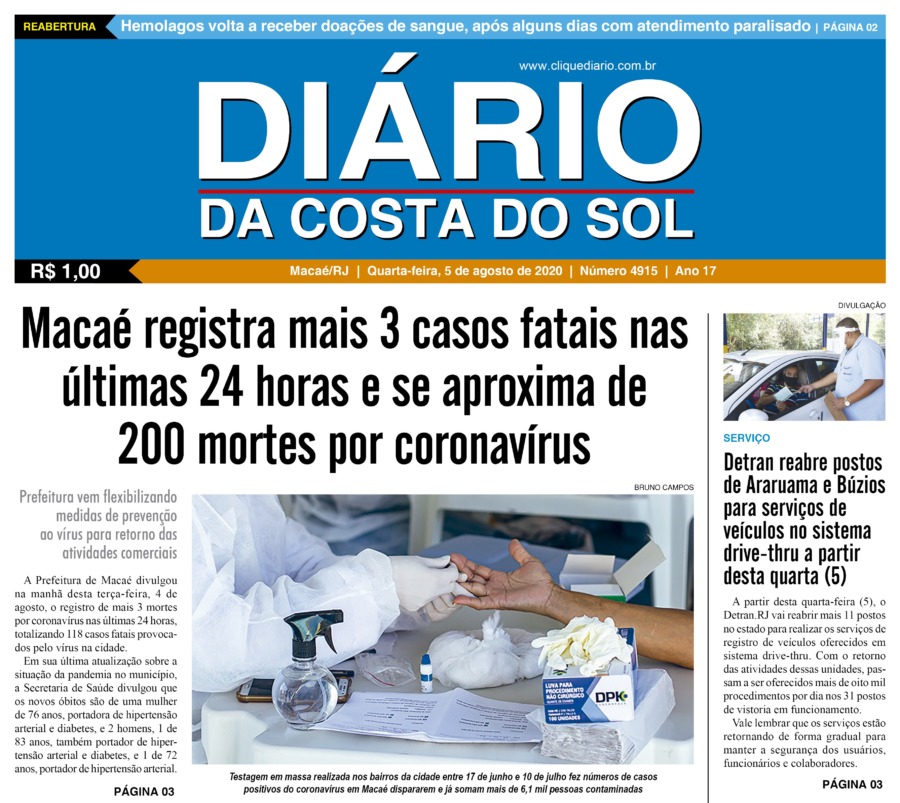 Edições Impressas Edição de quarta-feira 05/08/2020 nº 4915 Publicado em 05/08/2020 - 05:00 Escrito por Fernando Vitor Notícias relacionadas: Seguinte Edição de quinta-feira 06/08/2020 nº 4916 Anterior Edição de terça-feira 04/08/2020 nº 4914 Fernando Vitor Notícias Recentes Cabo Frio15 horas atrás Arte e solidariedade marcam a 1ª Mostra de Dança Regional de Tamoios Cidades20 horas atrás Região serrana de Macaé recebe 1º X-Force Passeio de Quadriciclo e Aranha neste domingo (26) Polícia20 horas atrás Polícia apreende mais de meio quilo de drogas no Loteamento São João, em Rio das Ostras Saúde2 dias atrás Eventos esportivo e cultural reforça campanha do Outubro Rosa em Rio das Ostras nesse domingo, 26 Edições Impressas2 dias atrás Sábado a segunda-feira 25 a 27/10/2025 nº 6197 Cidades2 dias atrás Shopping Plaza Macaé oferece programação gratuita com feira de adoção e show de pagode neste fim de semana Cidades3 dias atrás 32º BPM completa 23 anos com solenidade de celebração e reconhecimento aos policiais Armação dos Búzios3 dias atrás Búzios celebra esporte e superação com XC RUN 2025 Araruama3 dias atrás Araruama promove saúde, lazer e cidadania em evento comunitário Arraial do cabo3 dias atrás Educação e sustentabilidade se encontram para jovens de Arraial do Cabo Clique Diário E. L. Mídia Editora Ltda CNPJ: 09.298.880/0001-07 Redação: Rua Tupinambás 122 Gloria – Macaé/RJ comercial@diariocs.com (22) 2765-7353 (22) 999253130 Mais lidas da semana Cultura7 dias atrás Silva Jardim anuncia shows gratuitos de samba e pagode para o fim de semana Cultura6 dias atrás Música, emoção e cores: Rodrigo Pontes apresenta show especial em Rio das Ostras Cabo Frio6 dias atrás Atletas de várias cidades se enfrentam em competição de Muay Thai em Cabo Frio Cabo Frio6 dias atrás Serviços essenciais permanecem ativos durante ponto facultativo em Cabo Frio