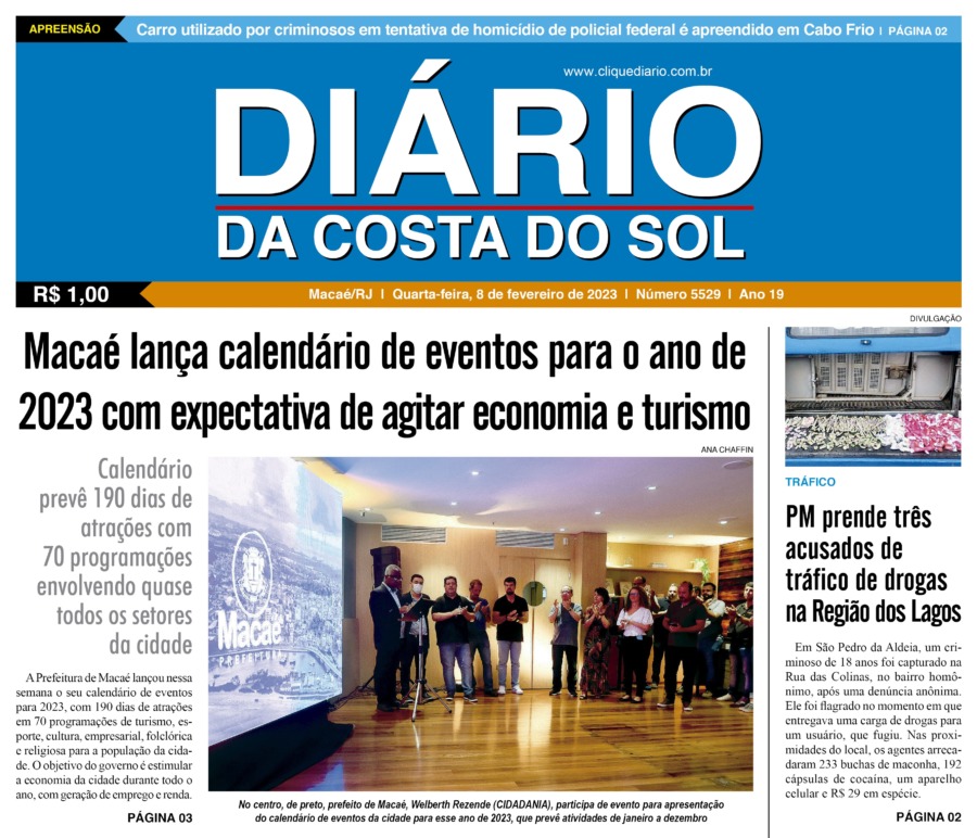 Edições Impressas Edição de quarta-feira 08/02/2023 nº 5529 Publicado em 08/02/2023 - 00:00 Escrito por Redação Notícias relacionadas: Seguinte Edição de quinta-feira 09/02/2023 nº 5530 Anterior Edição de terça-feira 07/02/2023 nº 5528 Redação Notícias Recentes Cabo Frio12 horas atrás Ação conjunta em Cabo Frio testa resposta rápida a incêndio em embarcação Cabo Frio12 horas atrás Bombeiros socorrem vítimas de colisão entre carro e motocicleta em Cabo Frio Cabo Frio12 horas atrás Cabo Frio reforça importância da prevenção com evento especial para servidoras da Comsercaf Polícia12 horas atrás Polícia Civil e Rio+ promovem operação contra furto de água em Rio das Ostras Arraial do cabo13 horas atrás Prefeitura de Arraial atualiza cadastro de famílias em área de preservação no Caiçara Arraial do cabo13 horas atrás Vistoria do Ipem facilita regularização de taxistas em Arraial do Cabo Cabo Frio13 horas atrás Biblioteca de Cabo Frio promove celebração artística e literária em homenagem aos poetas Cabo Frio13 horas atrás Canoa havaiana leva mensagem de coragem e prevenção pelo Canal do Itajuru, Cabo Frio Cabo Frio13 horas atrás Sede da Guarda Municipal de Cabo Frio vira espaço de acolhimento e saúde para mulheres Polícia13 horas atrás 32º BPM realizou 12 prisões em cidades da região em 24 horas Clique Diário E. L. Mídia Editora Ltda CNPJ: 09.298.880/0001-07 Redação: Rua Tupinambás 122 Gloria – Macaé/RJ comercial@diariocs.com (22) 2765-7353 (22) 999253130 Mais lidas da semana Cultura3 dias atrás Silva Jardim anuncia shows gratuitos de samba e pagode para o fim de semana Edições Impressas6 dias atrás Edição de sexta-feira 17/10/2025 nº 6192 Cultura2 dias atrás Música, emoção e cores: Rodrigo Pontes apresenta show especial em Rio das Ostras Polícia3 dias atrás Policiais da PRF salvam bebê engasgado na BR-101, em Campos