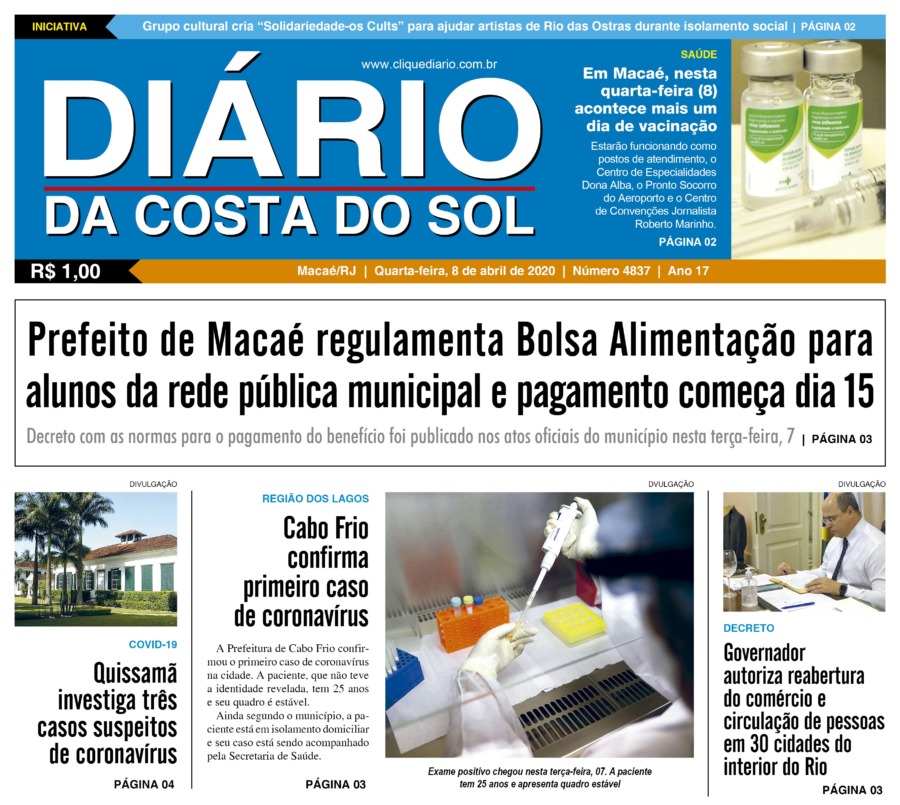 Edições Impressas Edição de quarta-feira, 08/04/2020 nº 4837 Publicado em 08/04/2020 - 07:00 Escrito por Fernando Vitor Notícias relacionadas: Seguinte Edição de quinta-feira, 09/04/2020 nº 4838 Anterior Edição de terça-feira, 07/04/2020 nº 4836 Fernando Vitor Notícias Recentes Cultura8 horas atrás Espetáculo “O Mágico de Oz” retorna aos palcos de Rio das Ostras nesse domingo, 2 Sem categoria9 horas atrás Macaé abre inscrições para a terceira edição da Semana Empreendedora Cidades1 dia atrás Rio das Ostras prepara cemitérios da cidade para o feriado de Finados nesse domingo, 2 Edições Impressas1 dia atrás Edição de sábado a segunda-feira 01 a 03/11/2025 nº 6203 Cidades1 dia atrás Macaé tem fim de semana repleto de competições esportivas Araruama2 dias atrás Expo Araruama 2025 promete fim de semana de música, cultura e sabor no Parque da Fazendinha Cabo Frio2 dias atrás Forças de segurança intensificam combate ao tráfico e prendem dupla de Cabo Frio Infraestrutura2 dias atrás Equipes de serviços públicos segue atuando em vários pontos de Rio das Ostras Arraial do cabo2 dias atrás Educação, inovação e meio ambiente se encontram na Arraial EXPO XP 2025 Cidades2 dias atrás Quissamã realiza entrega de certificados a visitadoras do Programa Criança Feliz Clique Diário E. L. Mídia Editora Ltda CNPJ: 09.298.880/0001-07 Redação: Rua Tupinambás 122 Gloria – Macaé/RJ comercial@diariocs.com (22) 2765-7353 (22) 999253130 Mais lidas da semana Cultura4 dias atrás Prédio da Onda, em Rio das Ostras, recebe oficina teatral gratuita a partir dessa quinta, 30 Arraial do cabo4 dias atrás Castração sem custo é retomada em Arraial do Cabo para controle populacional de gatos Polícia6 dias atrás Polícia descobre esconderijo do tráfico e apreende grande quantidade de drogas em Macaé Cidades4 dias atrás Silva Jardim tem evento do Outubro Rosa nessa quinta, 30, no Teatro