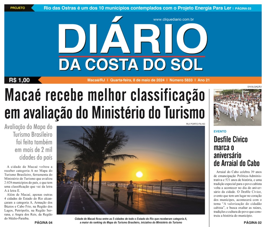 Edições Impressas Edição de quarta-feira 08/05/2024 nº 5833 Publicado em 07/05/2024 - 23:55 Escrito por Redação Notícias relacionadas: Seguinte Edição quinta-feira 09/05/2024 nº 5834 Anterior Edição de terça-feira 07/05/2024 nº 5832 Redação Notícias Recentes Cultura44 minutos atrás Rio das Ostras tem 2 cineclubes selecionados para 2ª Mostra Mercosul Audiovisual Cidades56 minutos atrás Câmara de Macaé debate aumento de acidentes e propõe Semana de Prevenção a Acidentes com Motociclistas Arraial do cabo1 hora atrás Instituto de Previdência de Arraial do Cabo aplica provas objetivas neste domingo (2) Cidades1 hora atrás Quissamã é destaque nacional ao integrar rede de inovação em Atenção Primária à Saúde da Fiocruz Cabo Frio1 hora atrás Cabo Frio inicia obra de reestruturação na Praça São Benedito para melhorar mobilidade e segurança Cabo Frio1 hora atrás Obra na Rua dos Biquínis marca nova fase de valorização dos espaços públicos em Cabo Frio Polícia1 hora atrás Mulher é morta a tiros enquanto carregava bebê no colo em Campos Armação dos Búzios2 horas atrás Búzios sedia Encontro Fluminense FBHA com foco no fortalecimento do turismo regional Cultura2 horas atrás Festival de Frutos do Mar de Rio das Ostras é lançado em evento para convidados Mobilidade3 horas atrás Acidente assusta moradores e deixa RJ-106 interditada em Saquarema Clique Diário E. L. Mídia Editora Ltda CNPJ: 09.298.880/0001-07 Redação: Rua Tupinambás 122 Gloria – Macaé/RJ comercial@diariocs.com (22) 2765-7353 (22) 999253130 Mais lidas da semana Edições Impressas3 dias atrás Edição de sábado a segunda-feira 25 a 27/10/2025 nº 6198 Edições Impressas6 dias atrás Edição de quarta-feira 22/10/2025 nº 6195 Edições Impressas4 dias atrás Edição de sexta-feira 24/10/2025 nº 6197 Edições Impressas5 dias atrás Edição de quinta-feira 23/10/2025 nº 6196