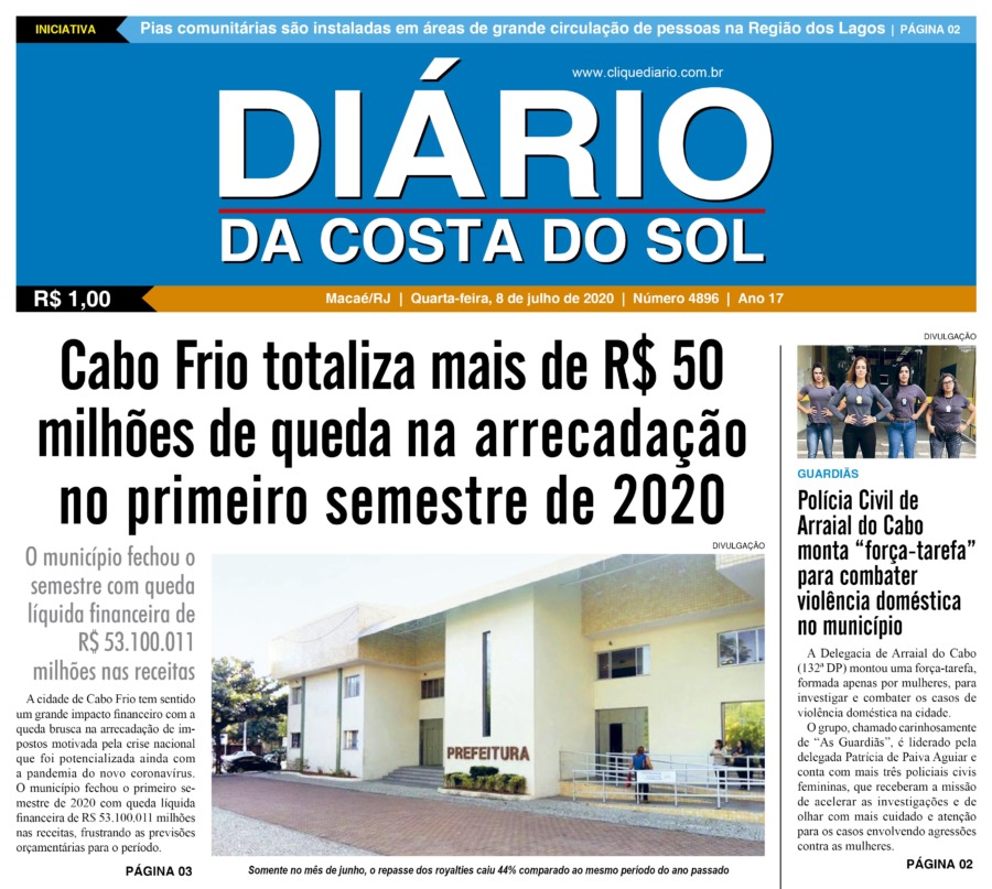 Edições Impressas Edição de quarta-feira 08/07/2020 nº 4896 Publicado em 08/07/2020 - 05:00 Escrito por Fernando Vitor Notícias relacionadas: Seguinte Edição de quinta-feira 09/07/2020 nº 4897 Anterior Edição de terça-feira 07/07/2020 nº 4895 Fernando Vitor Notícias Recentes Cidades32 minutos atrás Macaé realizou 5ª Corrida e Caminhada Outubro Rosa Novembro Azul na orla da Imbetiba Cidades35 minutos atrás Rio das Ostras autua Rio+ por mais um caso de vazamento de esgoto na cidade Cabo Frio41 minutos atrás Ação da Prefeitura e AAMA leva reflexão sobre autocuidado e prevenção do câncer de mama em Cabo Frio Cidades44 minutos atrás Casa do Servidor em Macaé ultrapassa 7 mil atendimentos em oito meses de funcionamento Polícia57 minutos atrás Foragido da Justiça é preso pela PM na BR-101 em Campos Araruama1 hora atrás Prefeitura define plano de segurança integrado para a Expo Araruama Iguaba1 hora atrás Prefeitura de Iguaba Grande prepara nova turma de aprendizes para atuação em órgãos públicos Cabo Frio1 hora atrás Mostra de Dança movimenta Cabo Frio com apresentações, solidariedade e cultura local Cabo Frio1 hora atrás Cabo Frio dá início à formação obrigatória para ambulantes das praias Polícia2 horas atrás Homem é preso com rádios transmissores em depósito de Casimiro de Abreu Clique Diário E. L. Mídia Editora Ltda CNPJ: 09.298.880/0001-07 Redação: Rua Tupinambás 122 Gloria – Macaé/RJ comercial@diariocs.com (22) 2765-7353 (22) 999253130 Mais lidas da semana Edições Impressas5 dias atrás Edição de quarta-feira 22/10/2025 nº 6195 Arraial do cabo7 dias atrás Prisão em flagrante marca operação da Patrulha Maria da Penha em Arraial do Cabo Cultura6 dias atrás Música, emoção e cores: Rodrigo Pontes apresenta show especial em Rio das Ostras Edições Impressas4 dias atrás Edição de quinta-feira 23/10/2025 nº 6196