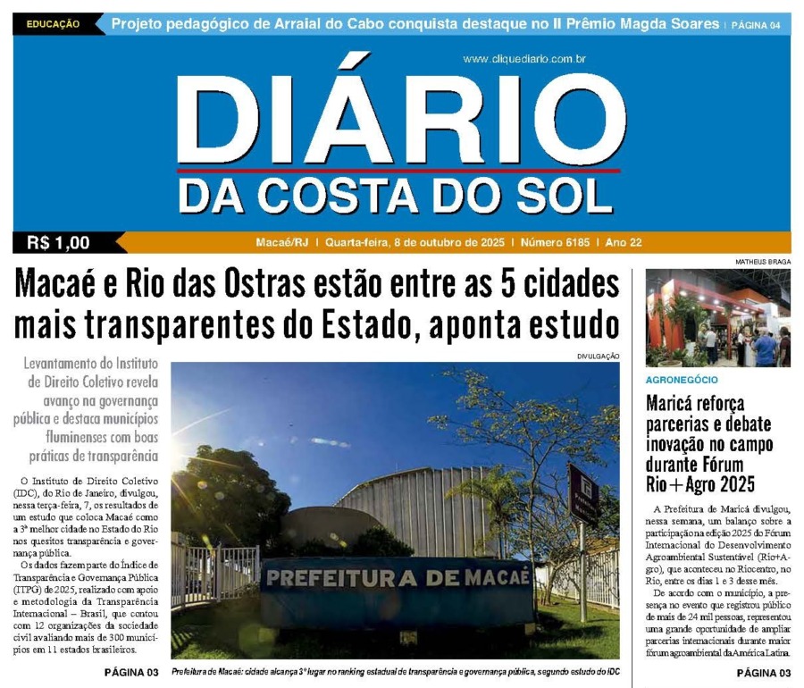 Edições Impressas Edição de quarta-feira 08/10/2025 nº 6185 Publicado em 08/10/2025 - 09:35 Escrito por Redação Notícias relacionadas: Seguinte Edição de quinta-feira 09/10/2025 nº 6186 Anterior Edição de terça-feira 07/10/2025 nº 6184 Redação Notícias Recentes Cabo Frio9 horas atrás Agentes de Cabo Frio recebem novo treinamento técnico para atuar em casos de poluição sonora Cabo Frio10 horas atrás Homem procurado por latrocínio é detido por agentes em Cabo Frio Cabo Frio10 horas atrás Representante da Guarda Civil de Cabo Frio compete na etapa final ao lado de jovens atletas Polícia10 horas atrás Prefeito de Rio das Ostras volta de Brasília com esperança de novos investimentos Cidades10 horas atrás Campos publica 8ª convocação e chama 374 professores substitutos para a rede municipal Esporte11 horas atrás De Saquarema para o Brasileirão: Vasco troca gramado de São Januário Cidades11 horas atrás Quissamã inicia planejamento educacional para 2026 com foco em Educação Financeira Polícia14 horas atrás Mulher é presa na RJ-106, em Saquarema, com R$ 38 mil em drogas e arma Saúde14 horas atrás Silva Jardim tem aulão em alusão à campanha mundial do Novembro Azul Mobilidade15 horas atrás Mobilidade promove fiscalização para verificar situação de táxis em Rio das Ostras Clique Diário E. L. Mídia Editora Ltda CNPJ: 09.298.880/0001-07 Redação: Rua Tupinambás 122 Gloria – Macaé/RJ comercial@diariocs.com (22) 2765-7353 (22) 999253130 Mais lidas da semana Cultura15 horas atrás Adilson Lopes apresenta exposição “Trajetória” em Casimiro de Abreu Cidades3 dias atrás Servidores de Rio das Ostras participam de treinamento do Estado em Búzios Polícia3 dias atrás Farmácia é interditada e uma pessoa é presa em Rio das Ostras em operação da Polícia Federal Cidades2 dias atrás Vereadores de Macaé vão embarcar nesta quinta para participar da COP 30 em Belém