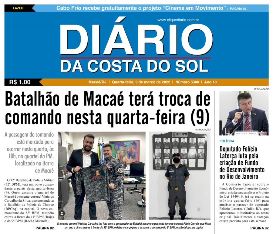 Edições Impressas Edição de quarta-feira 09/03/2022 nº 5300 Publicado em 08/03/2022 - 23:55 Escrito por Fernando Vitor Notícias relacionadas: Seguinte Edição de quinta-feira 10/03/2022 nº 5301 Anterior Edição de terça-feira 08/03/2022 nº 5299 Fernando Vitor Notícias Recentes Cidadania5 minutos atrás Distrito de Casimiro de Abreu recebe Programa RJ para Todos, do governo estadual Cultura2 horas atrás Moda e Prosa Caipira tem sua 6ª edição nessa quinta, 20, em Saquarema Comércio4 horas atrás Rio das Ostras tem 19ª edição de sua tradicional feira outlet nesse feriado Cidades4 horas atrás Macaé recebe 20ª edição do Prefeitura Presente no dia 25 de novembro Polícia5 horas atrás Denúncia anônima leva à prisão de duas mulheres por tráfico em Macaé Cidades5 horas atrás Caravana de Natal Coca-Cola passa por Rio das Ostras e Casimiro de Abreu nessa quinta, 20 Edições Impressas6 horas atrás Edição de quarta-feira 19/11/2025 nº 6215 Arraial do cabo22 horas atrás Educação de Arraial do Cabo orienta responsáveis sobre rematrícula para o próximo ano Cabo Frio22 horas atrás Evento comercial mais aguardado de Cabo Frio atinge 100% de estandes vendidos Saúde22 horas atrás Rio das Ostras comemora melhorias no atendimento da saúde municipal Clique Diário E. L. Mídia Editora Ltda CNPJ: 09.298.880/0001-07 Redação: Rua Tupinambás 122 Gloria – Macaé/RJ comercial@diariocs.com (22) 2765-7353 (22) 999253130 Mais lidas da semana Cultura5 dias atrás Adilson Lopes apresenta exposição “Trajetória” em Casimiro de Abreu Meio Ambiente2 dias atrás Lagoa de Iriry, em Rio das Ostras, recebe nova sinalização focada em sustentabilidade Cidades6 dias atrás Macaé é finalista no Festival Internacional de Cinema Cristão com “A Paixão de Cristo” Cidades2 dias atrás Macaé registra avanço na coleta seletiva porta a porta e recolhe mais de 2 toneladas em 45 dias