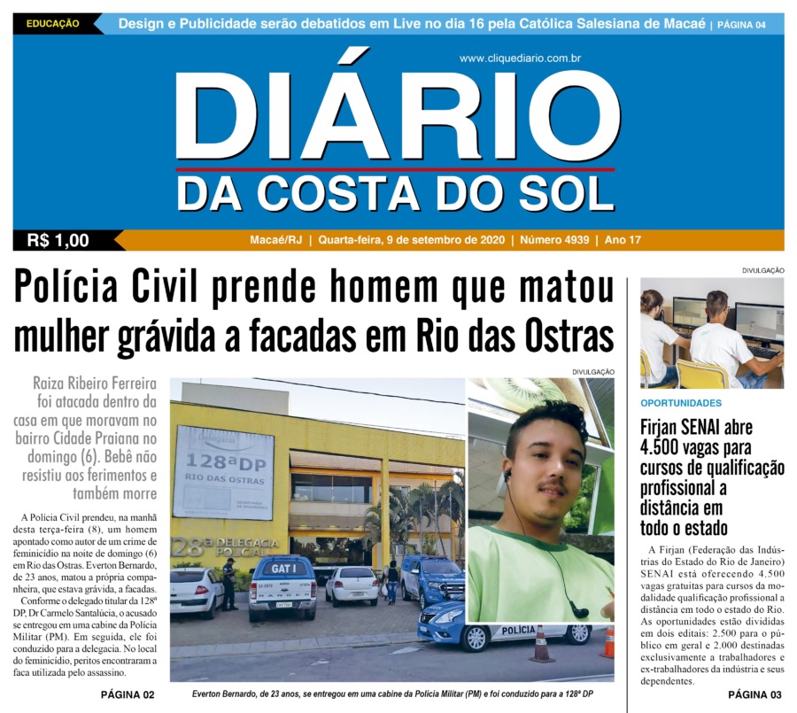 Edições Impressas Edição de quarta-feira 09/09/2020 nº 4939 Publicado em 09/09/2020 - 05:00 Escrito por Fernando Vitor Notícias relacionadas: Seguinte Edição de quinta-feira 10/09/2020 nº 4940 Anterior Edição de Sábado a Terça-feira 05 a 08/09/2020 nº 4938 Fernando Vitor Notícias Recentes Cabo Frio10 horas atrás Arte e solidariedade marcam a 1ª Mostra de Dança Regional de Tamoios Cidades15 horas atrás Região serrana de Macaé recebe 1º X-Force Passeio de Quadriciclo e Aranha neste domingo (26) Polícia15 horas atrás Polícia apreende mais de meio quilo de drogas no Loteamento São João, em Rio das Ostras Saúde1 dia atrás Eventos esportivo e cultural reforça campanha do Outubro Rosa em Rio das Ostras nesse domingo, 26 Edições Impressas2 dias atrás Sábado a segunda-feira 25 a 27/10/2025 nº 6197 Cidades2 dias atrás Shopping Plaza Macaé oferece programação gratuita com feira de adoção e show de pagode neste fim de semana Cidades2 dias atrás 32º BPM completa 23 anos com solenidade de celebração e reconhecimento aos policiais Armação dos Búzios2 dias atrás Búzios celebra esporte e superação com XC RUN 2025 Araruama2 dias atrás Araruama promove saúde, lazer e cidadania em evento comunitário Arraial do cabo2 dias atrás Educação e sustentabilidade se encontram para jovens de Arraial do Cabo Clique Diário E. L. Mídia Editora Ltda CNPJ: 09.298.880/0001-07 Redação: Rua Tupinambás 122 Gloria – Macaé/RJ comercial@diariocs.com (22) 2765-7353 (22) 999253130 Mais lidas da semana Cultura6 dias atrás Silva Jardim anuncia shows gratuitos de samba e pagode para o fim de semana Cultura6 dias atrás Música, emoção e cores: Rodrigo Pontes apresenta show especial em Rio das Ostras Cabo Frio6 dias atrás Atletas de várias cidades se enfrentam em competição de Muay Thai em Cabo Frio Cabo Frio6 dias atrás Serviços essenciais permanecem ativos durante ponto facultativo em Cabo Frio