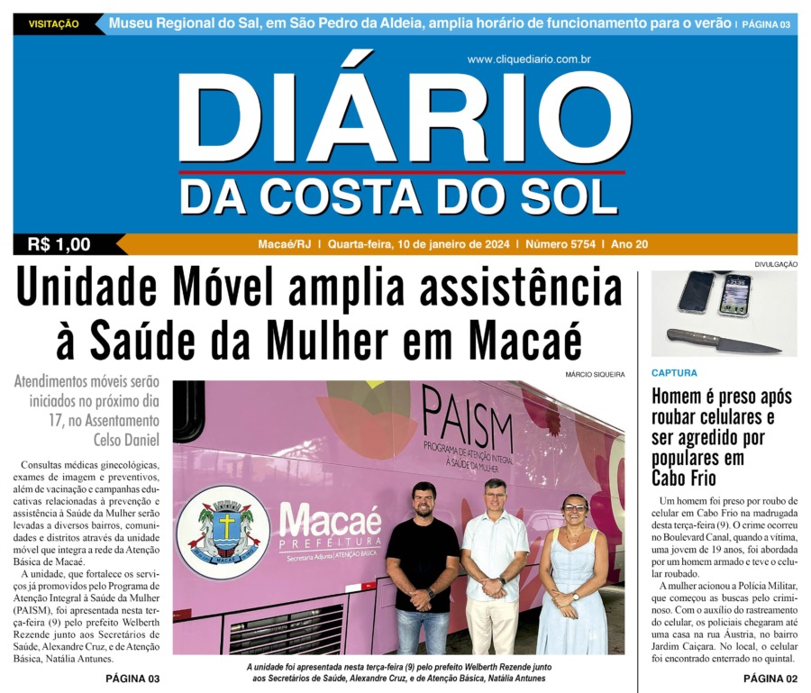 Edições Impressas Edição de quarta-feira 10/01/2024 nº 5754 Publicado em 09/01/2024 - 23:55 Escrito por Redação Notícias relacionadas: Seguinte Edição de quinta-feira 11/01/2024 nº 5755 Anterior Edição de terça-feira 09/01/2024 nº 5753 Redação Notícias Recentes Saúde20 horas atrás Eventos esportivo e cultural reforça campanha do Outubro Rosa em Rio das Ostras nesse domingo, 26 Edições Impressas23 horas atrás Sábado a segunda-feira 25 a 27/10/2025 nº 6197 Cidades1 dia atrás Shopping Plaza Macaé oferece programação gratuita com feira de adoção e show de pagode neste fim de semana Cidades2 dias atrás 32º BPM completa 23 anos com solenidade de celebração e reconhecimento aos policiais Armação dos Búzios2 dias atrás Búzios celebra esporte e superação com XC RUN 2025 Araruama2 dias atrás Araruama promove saúde, lazer e cidadania em evento comunitário Arraial do cabo2 dias atrás Educação e sustentabilidade se encontram para jovens de Arraial do Cabo Cidades2 dias atrás Quissamã avança na reformulação do Currículo Municipal de Educação Arraial do cabo2 dias atrás PIPE estimula presença e desempenho de alunos da rede pública de Arraial em programa estudantil Cabo Frio2 dias atrás Prefeitura de Cabo Frio prepara espaço para visitação no Dia de Finados Clique Diário E. L. Mídia Editora Ltda CNPJ: 09.298.880/0001-07 Redação: Rua Tupinambás 122 Gloria – Macaé/RJ comercial@diariocs.com (22) 2765-7353 (22) 999253130 Mais lidas da semana Cultura6 dias atrás Silva Jardim anuncia shows gratuitos de samba e pagode para o fim de semana Cabo Frio6 dias atrás Atletas de várias cidades se enfrentam em competição de Muay Thai em Cabo Frio Cabo Frio6 dias atrás Serviços essenciais permanecem ativos durante ponto facultativo em Cabo Frio Arraial do cabo6 dias atrás Prisão em flagrante marca operação da Patrulha Maria da Penha em Arraial do Cabo