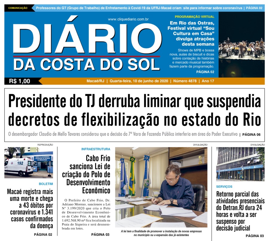 Edições Impressas Edição de quarta-feira 10/06/2020 nº 4878 Publicado em 10/06/2020 - 05:00 Escrito por Fernando Vitor Notícias relacionadas: Seguinte Edição de quinta a segunda-feira 11 a 15/06/2020 nº 4879 Anterior Edição de terça-feira 09/06/2020 nº 4877 Fernando Vitor Notícias Recentes Cultura12 horas atrás Rio das Ostras tem 2 cineclubes selecionados para 2ª Mostra Mercosul Audiovisual Cidades13 horas atrás Câmara de Macaé debate aumento de acidentes e propõe Semana de Prevenção a Acidentes com Motociclistas Arraial do cabo13 horas atrás Instituto de Previdência de Arraial do Cabo aplica provas objetivas neste domingo (2) Cidades13 horas atrás Quissamã é destaque nacional ao integrar rede de inovação em Atenção Primária à Saúde da Fiocruz Cabo Frio13 horas atrás Cabo Frio inicia obra de reestruturação na Praça São Benedito para melhorar mobilidade e segurança Cabo Frio13 horas atrás Obra na Rua dos Biquínis marca nova fase de valorização dos espaços públicos em Cabo Frio Polícia13 horas atrás Mulher é morta a tiros enquanto carregava bebê no colo em Campos Armação dos Búzios13 horas atrás Búzios sedia Encontro Fluminense FBHA com foco no fortalecimento do turismo regional Cultura14 horas atrás Festival de Frutos do Mar de Rio das Ostras é lançado em evento para convidados Mobilidade14 horas atrás Acidente assusta moradores e deixa RJ-106 interditada em Saquarema Clique Diário E. L. Mídia Editora Ltda CNPJ: 09.298.880/0001-07 Redação: Rua Tupinambás 122 Gloria – Macaé/RJ comercial@diariocs.com (22) 2765-7353 (22) 999253130 Mais lidas da semana Edições Impressas4 dias atrás Edição de sábado a segunda-feira 25 a 27/10/2025 nº 6198 Edições Impressas7 dias atrás Edição de quarta-feira 22/10/2025 nº 6195 Cabo Frio15 horas atrás Audiência pública discute receitas e despesas previstas para Cabo Frio no próximo ano Edições Impressas6 dias atrás Edição de quinta-feira 23/10/2025 nº 6196
