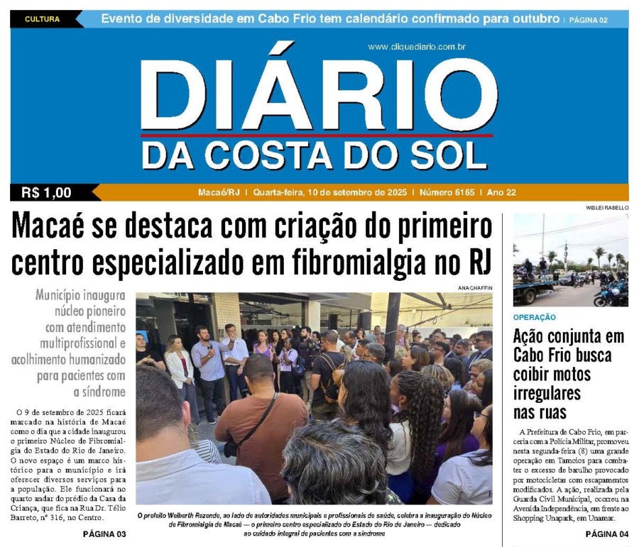 Edições Impressas Edição de quarta-feira 10/09/2025 nº 6165 Publicado em 10/09/2025 - 09:22 Escrito por Redação Notícias relacionadas: Seguinte Edição de quinta-feira 11/09/2025 nº 6166 Anterior Edição de terça-feira 09/09/2025 nº 6164 Redação Notícias Recentes Cabo Frio7 horas atrás Estudantes de Cabo Frio brilham em premiação do projeto CaptaAção Armação dos Búzios12 horas atrás Búzios Swim celebra esporte, natureza e turismo na Região dos Lagos Cabo Frio13 horas atrás Educação pública de Cabo Frio colhe frutos com conquistas em competições científicas Edições Impressas14 horas atrás Edição de sábado a segunda-feira 08 a 10/11/2025 nº 6208 Polícia14 horas atrás Moto sem placa é abandonada após fuga de suspeito em Macaé Polícia15 horas atrás Polícia Civil prende homem em flagrante por tráfico de drogas no Parque Aeroporto, em Macaé Iguaba1 dia atrás Menina de Iguaba Grande realiza sonho e conhece o príncipe William no Rio de Janeiro Arraial do cabo1 dia atrás Arraial do Cabo é exemplo de tranquilidade na Região dos Lagos, segundo dados do ISP Arraial do cabo1 dia atrás Festival em Arraial do Cabo promete recorde de público com mais de 15 mil pratos e 10 mil litros de chope Arraial do cabo1 dia atrás Oficina une saúde, cidadania e acolhimento em Arraial do Cabo Clique Diário E. L. Mídia Editora Ltda CNPJ: 09.298.880/0001-07 Redação: Rua Tupinambás 122 Gloria – Macaé/RJ comercial@diariocs.com (22) 2765-7353 (22) 999253130 Mais lidas da semana Arraial do cabo2 dias atrás Arraial do Cabo celebra 3ª edição do Festival de Frutos do Mar com entrada livre; Carol Biazin, Ramona Rox, Liah Soares e mais Turismo5 dias atrás Saquarema celebra reconhecimento de projeto pelo Ministério do Turismo Educação5 dias atrás Estudantes de Rio das Ostras são destaques em evento nacional da Educação Cidades4 dias atrás HFM ganha novo Pronto-Socorro moderno e ampliado em Campos