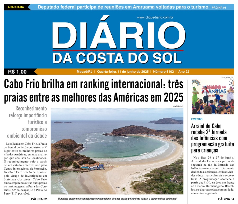 Edições Impressas Edição de quarta-feira 11/06/2025 nº 6102 Publicado em 11/06/2025 - 09:33 Escrito por Redação Notícias relacionadas: Seguinte Edição de quinta-feira 12/06/2025 nº 6103 Anterior Edição de terça-feira 10/06/2025 nº 6101 Redação Notícias Recentes Cabo Frio16 horas atrás Reforma marca nova fase para o esporte cabo-friense e aniversário da cidade Arraial do cabo16 horas atrás Fórum de Arraial propõe novo modelo de desenvolvimento baseado nos 3Ds; Desvincular, Descarbonizar e Descontaminar Saúde17 horas atrás Saúde de Rio das Ostras promove mutirão de cirurgia pediátrica nessa semana Cidades17 horas atrás Guarda Ambiental resgata jiboia de três metros em área urbana de Macaé Cidades17 horas atrás Vereadores de Macaé vão embarcar nesta quinta para participar da COP 30 em Belém Arraial do cabo17 horas atrás Parceria com a PF fortalece preparo técnico da Segurança Pública de Arraial do Cabo Arraial do cabo17 horas atrás Iniciativa busca compensar emissões de carbono da frota de Arraial Cidades18 horas atrás Parceria com o Estado reforça prevenção de enchentes em Rio das Ostras há 39 dias do verão Desenvolvimento19 horas atrás Arteris vence novo leilão da BR-101 e mantém operação da via até 2047 Cidades19 horas atrás Prefeitura de Quissamã abre prazo para solicitação de isenção do IPTU 2026 e 2027 Clique Diário E. L. Mídia Editora Ltda CNPJ: 09.298.880/0001-07 Redação: Rua Tupinambás 122 Gloria – Macaé/RJ comercial@diariocs.com (22) 2765-7353 (22) 999253130 Mais lidas da semana Arraial do cabo7 dias atrás Arraial do Cabo celebra 3ª edição do Festival de Frutos do Mar com entrada livre; Carol Biazin, Ramona Rox, Liah Soares e mais Meio Ambiente7 dias atrás Ações do Programa Limpa Rio seguem em vários pontos de Rio das Ostras Polícia23 horas atrás Farmácia é interditada e uma pessoa é presa em Rio das Ostras em operação da Polícia Federal Cidades7 dias atrás Quissamã participa do lançamento do Programa Ambiente Resiliente, do Governo do Estado
