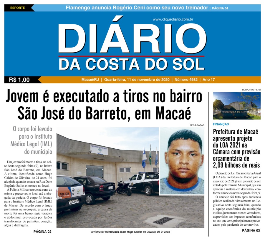 Edições Impressas Edição de quarta-feira 11/11/2020 nº 4982 Publicado em 11/11/2020 - 00:13 Escrito por Fernando Vitor Notícias relacionadas:destaque Seguinte Edição de quinta-feira 12/11/2020 nº 4983 Anterior Edição de terça-feira 10/11/2020 nº 4981 Fernando Vitor Notícias Recentes São Pedro da Aldeia8 horas atrás Feirão de Empregabilidade promete movimentar a Praça das Águas em São Pedro da Aldeia Diversão8 horas atrás Praia do Abricó, em Rio das Ostras, sedia evento fitness nesse fim de semana Arraial do cabo8 horas atrás Feira de Ciências e Tecnologia em Arraial tem visita ilustre dos cães da Segurança Pública Arraial do cabo8 horas atrás Arraial do Cabo tem renovação da certificação Internacional de turismo sustentável na Lagoa do Caiçara Cabo Frio8 horas atrás Cercamento e plantio de espécies nativas marcam nova fase de recuperação ambiental em Cabo Frio Cidades8 horas atrás Homem é preso com grande quantidade de drogas no Lagomar, em Macaé Cidades9 horas atrás Alerj aprova projeto que garante salário integral a familiares de PMs mortos em combate Cidades9 horas atrás GCM de Campos participa de curso de operador da Patrulha Maria da Penha em Niterói Meio Ambiente9 horas atrás Ações do Programa Limpa Rio seguem em vários pontos de Rio das Ostras Cidades9 horas atrás Quissamã participa do lançamento do Programa Ambiente Resiliente, do Governo do Estado Clique Diário E. L. Mídia Editora Ltda CNPJ: 09.298.880/0001-07 Redação: Rua Tupinambás 122 Gloria – Macaé/RJ comercial@diariocs.com (22) 2765-7353 (22) 999253130 Mais lidas da semana Mobilidade7 dias atrás Rio das Ostras intensifica ações de combate a irregularidades no trânsito Cidades2 dias atrás HFM ganha novo Pronto-Socorro moderno e ampliado em Campos Educação7 dias atrás Cerimônia no Teatro fecha o 2º Prêmio Literário do Ensino Fundamental de Rio das Ostras Cultura6 dias atrás Nova temporada do Rio das Ostras Instrumental apresenta show de Nico Rezende
