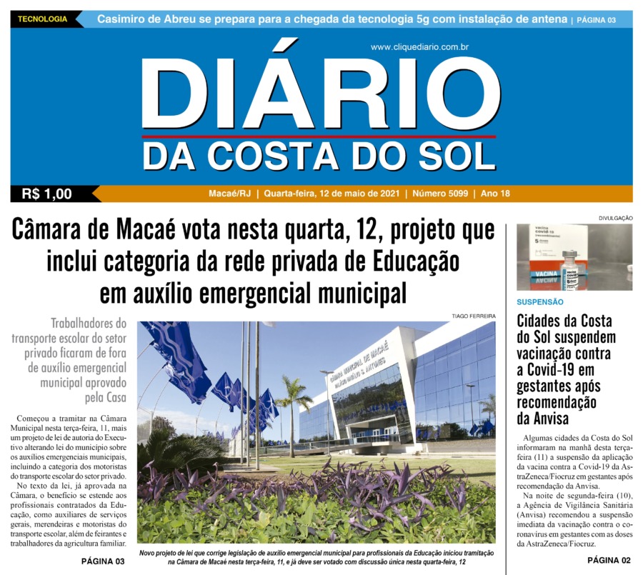 Edições Impressas Edição de quarta-feira 12/05/2021 nº 5099 Publicado em 12/05/2021 - 00:00 Escrito por Fernando Vitor Notícias relacionadas:destaque Seguinte Edição de quinta-feira 13/05/2021 nº 5100 Anterior Edição de terça-feira 11/05/2021 nº 5098 Fernando Vitor Notícias Recentes Cultura24 minutos atrás Adilson Lopes apresenta exposição “Trajetória” em Casimiro de Abreu Cidades24 minutos atrás Prefeito reforça potencial econômico de Macaé em debate sobre avanços de voos comerciais Polícia44 minutos atrás Macaé registra menor número de roubos de rua da história em outubro Polícia54 minutos atrás Três membros de facção criminosa foram presos em Macaé durante operação da Polícia Civil Edições Impressas58 minutos atrás Edição de sexta-feira 14/11/2025 nº 6212 Cidades18 horas atrás Macaé discute armamento da Guarda Municipal como parte de ações para fortalecer a segurança pública Araruama18 horas atrás Presos em Araruama tinham mandados por roubo e associação criminosa Educação18 horas atrás Inscrição para vagas nas creches de Rio das Ostras em 2026 termina nessa sexta, 14 Cabo Frio18 horas atrás Cabo Frio executa nova etapa de sinalização horizontal na cidade Cidades18 horas atrás Agricultores e pecuaristas de Quissamã participam de encontro de capacitação e orientação técnica Clique Diário E. L. Mídia Editora Ltda CNPJ: 09.298.880/0001-07 Redação: Rua Tupinambás 122 Gloria – Macaé/RJ comercial@diariocs.com (22) 2765-7353 (22) 999253130 Mais lidas da semana Polícia2 dias atrás Farmácia é interditada e uma pessoa é presa em Rio das Ostras em operação da Polícia Federal Cidades3 dias atrás Servidores de Rio das Ostras participam de treinamento do Estado em Búzios Cabo Frio7 dias atrás Prefeitura de Cabo Frio premia autoras com experiências culturais e incentivo à leitura Cidades2 dias atrás Vereadores de Macaé vão embarcar nesta quinta para participar da COP 30 em Belém