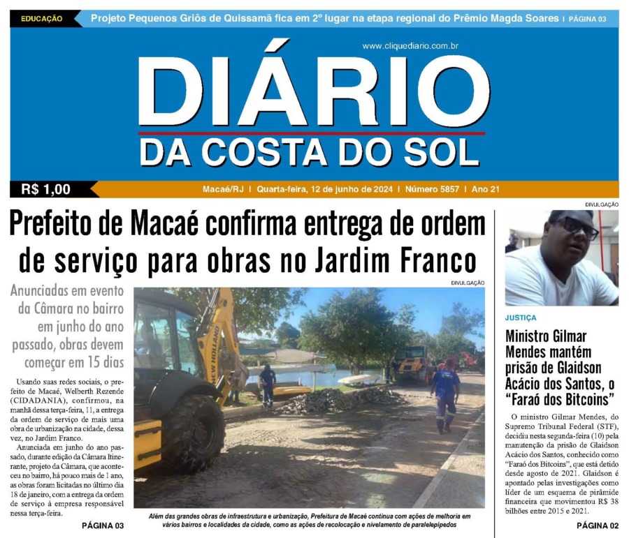 Edições Impressas Edição de quarta-feira 12/06/2024 nº 5857 Publicado em 12/06/2024 - 00:00 Escrito por Redação Notícias relacionadas: Seguinte Edição de quinta-feira 13/06/2024 nº 5858 Anterior Edição de terça-feira 11/06/2024 nº 5856 Redação Notícias Recentes Arraial do cabo6 horas atrás Arraial do Cabo promove imersão cultural no Mês da Consciência Negra com o Festival Ubuntu Arraial do cabo6 horas atrás Mutirão de Arraial do Cabo tem ação ambiental que incentiva preservação e recuperação da vegetação Arraial do cabo6 horas atrás Com três dias de shows e sabores, Arraial do Cabo celebra o melhor da culinária praiana Meio Ambiente7 horas atrás Travessia Mico-Leão Dourado tem 1º trecho inaugurado em Silva Jardim Arraial do cabo8 horas atrás Campanha Novembro Azul leva cuidados e prevenção aos trabalhadores do mar em Arraial do Cabo Cidades8 horas atrás Criança de 4 anos morre após broncoaspirar objeto em Campos Cidades8 horas atrás Servidores de Rio das Ostras participam de treinamento do Estado em Búzios Cabo Frio8 horas atrás Noite de pedal em Cabo Frio homenageia a história e o patrimônio local Cidades8 horas atrás Câmara de Macaé aprova Programa Saúde do Homem e regulamenta uso de IA no serviço público Cidades8 horas atrás Quissamã realiza ações do Novembro Azul com foco no cuidado integral à saúde do homem Clique Diário E. L. Mídia Editora Ltda CNPJ: 09.298.880/0001-07 Redação: Rua Tupinambás 122 Gloria – Macaé/RJ comercial@diariocs.com (22) 2765-7353 (22) 999253130 Mais lidas da semana Arraial do cabo5 dias atrás Arraial do Cabo celebra 3ª edição do Festival de Frutos do Mar com entrada livre; Carol Biazin, Ramona Rox, Liah Soares e mais Meio Ambiente6 dias atrás Programa do governo estadual promove limpeza de rio no Âncora, em Rio das Ostras Meio Ambiente5 dias atrás Ações do Programa Limpa Rio seguem em vários pontos de Rio das Ostras Cidades8 horas atrás Servidores de Rio das Ostras participam de treinamento do Estado em Búzios