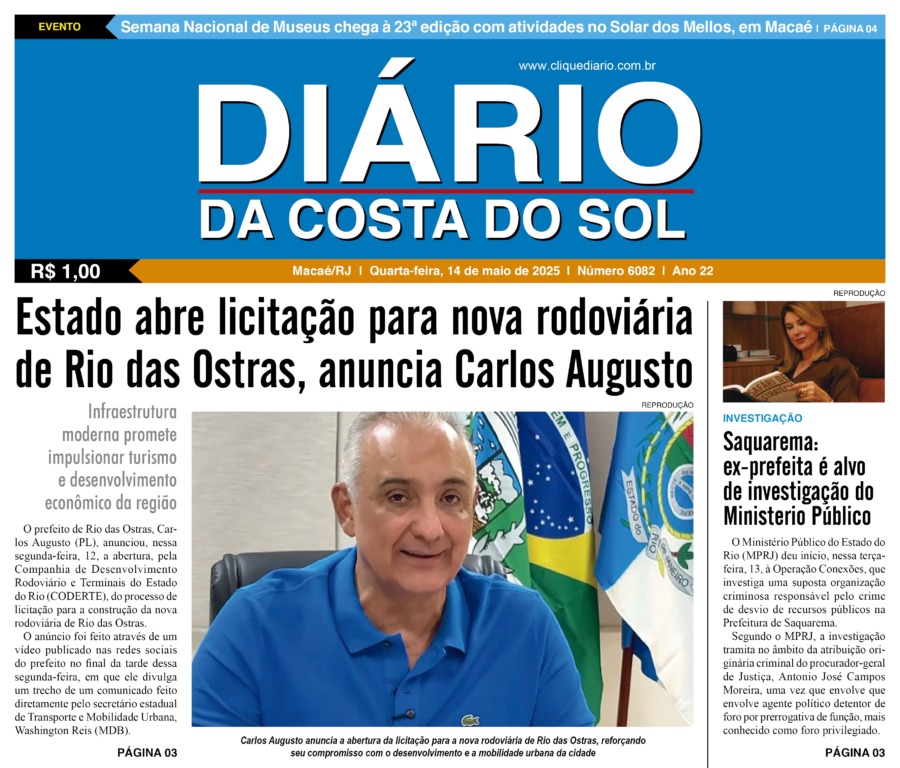 Edições Impressas Edição de quarta-feira 14/05/2025 nº 6082 Publicado em 14/05/2025 - 10:26 Escrito por Redação Notícias relacionadas: Seguinte Edição de quinta-feira 15/05/2025 nº 6083 Anterior Edição de terça-feira 13/05/2025 nº 6081 Redação Notícias Recentes Cabo Frio12 horas atrás Vendas de Natal em Cabo Frio mostram contrastes entre setores e consumidores Cidades12 horas atrás Bondinho da Praia volta a circular em Macaé a partir deste sábado (27) Edições Impressas1 dia atrás Edição de quarta a segunda-feira 24 a 29/12/2025 nº 6239 Arraial do cabo1 dia atrás Arraial do Cabo amplia educação ambiental com esculturas marinhas itinerantes Cidades2 dias atrás Macaé anuncia entregas de obras de infraestrutura e educação na próxima semana Cabo Frio2 dias atrás Cabo Frio amplia segurança nas travessias da Rodovia Amaral Peixoto Cabo Frio2 dias atrás Cabo Frio intensifica segurança da navegação durante a alta temporada Cidades2 dias atrás Saquarema lidera gestão ambiental na Região dos Lagos, aponta ICMS Ecológico 2025 Cidades2 dias atrás Mulher tem moto roubada durante assalto na BR-101, em Campos Armação dos Búzios2 dias atrás Búzios inicia verão com hotéis quase lotados e economia aquecida Clique Diário E. L. Mídia Editora Ltda CNPJ: 09.298.880/0001-07 Redação: Rua Tupinambás 122 Gloria – Macaé/RJ comercial@diariocs.com (22) 2765-7353 (22) 999253130 Mais lidas da semana Cabo Frio6 dias atrás Procon de Cabo Frio reforça parceria com a defesa do consumidor do estado Polícia3 dias atrás PM prende homem por tráfico de drogas no bairro Aeroporto Arraial do cabo6 dias atrás Instituto de previdência cabista publica resultado definitivo de concurso em Arraial do Cabo Cidades6 dias atrás Macaé amplia coleta seletiva com novos Ecopontos em funcionamento