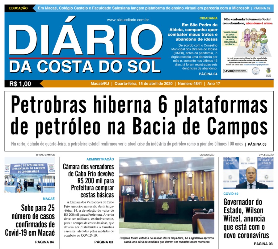 Edições Impressas Edição de quarta-feira, 15/04/2020 nº 4841 Publicado em 15/04/2020 - 07:00 Escrito por Fernando Vitor Notícias relacionadas: Seguinte Edição de quinta-feira, 16/04/2020 nº 4842 Anterior Edição de terça-feira, 14/04/2020 nº 4840 Fernando Vitor Notícias Recentes Cidades16 horas atrás Macaé discute armamento da Guarda Municipal como parte de ações para fortalecer a segurança pública Araruama16 horas atrás Presos em Araruama tinham mandados por roubo e associação criminosa Educação16 horas atrás Inscrição para vagas nas creches de Rio das Ostras em 2026 termina nessa sexta, 14 Cabo Frio16 horas atrás Cabo Frio executa nova etapa de sinalização horizontal na cidade Cidades16 horas atrás Agricultores e pecuaristas de Quissamã participam de encontro de capacitação e orientação técnica Arraial do cabo16 horas atrás Nova licença digital promete mais agilidade e transparência em Arraial do Cabo Polícia17 horas atrás Idoso é assassinado a tiros às margens da BR-101, em Campos Esporte17 horas atrás Atletas de Rio das Ostras e Saquarema conquistam título de brasileiro de bodyboarding Arraial do cabo17 horas atrás Sucesso de vendas faz pratos especiais continuarem até o fim de novembro em Arraial no Festival de Frutos do Mar Cabo Frio17 horas atrás Iniciativa reforça compromisso com a identidade cultural cabo-friense Clique Diário E. L. Mídia Editora Ltda CNPJ: 09.298.880/0001-07 Redação: Rua Tupinambás 122 Gloria – Macaé/RJ comercial@diariocs.com (22) 2765-7353 (22) 999253130 Mais lidas da semana Polícia2 dias atrás Farmácia é interditada e uma pessoa é presa em Rio das Ostras em operação da Polícia Federal Cidades3 dias atrás Servidores de Rio das Ostras participam de treinamento do Estado em Búzios Cabo Frio7 dias atrás Prefeitura de Cabo Frio premia autoras com experiências culturais e incentivo à leitura Cidades2 dias atrás Vereadores de Macaé vão embarcar nesta quinta para participar da COP 30 em Belém