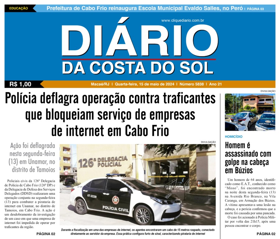 Edições Impressas Edição de quarta-feira 15/05/2024 nº 5838 Publicado em 15/05/2024 - 00:00 Escrito por Redação Notícias relacionadas: Seguinte Edição de quinta-feira 16/05/2024 nº 5839 Anterior Edição de Terça-feira 14/05/2024 nº 5837 Redação Notícias Recentes Meio Ambiente1 hora atrás Saquarema promove ação de limpeza de rios e canais do município Cidades3 horas atrás Carapebus realiza ação do Outubro Rosa com atividades de prevenção e acolhimento Polícia3 horas atrás Bandidos fogem deixando moto e drogas para trás após perseguição em Rio das Ostras Cidades3 horas atrás Vereadores de Macaé debatem ações para garantir mais segurança aos professores Polícia3 horas atrás Ação da PRF prende homem dirigindo carro clonado em Casimiro de Abreu Polícia4 horas atrás Polícia prende homem por tráfico de drogas no Parque Aeroporto, em Macaé Saúde4 horas atrás Campanha Outubro Verde e Rosa tem ação no centro de Rio das Ostras Edições Impressas5 horas atrás Edição de quinta-feira 23/10/2025 nº 6196 Cabo Frio21 horas atrás Ação conjunta em Cabo Frio testa resposta rápida a incêndio em embarcação Cabo Frio21 horas atrás Bombeiros socorrem vítimas de colisão entre carro e motocicleta em Cabo Frio Clique Diário E. L. Mídia Editora Ltda CNPJ: 09.298.880/0001-07 Redação: Rua Tupinambás 122 Gloria – Macaé/RJ comercial@diariocs.com (22) 2765-7353 (22) 999253130 Mais lidas da semana Cultura3 dias atrás Silva Jardim anuncia shows gratuitos de samba e pagode para o fim de semana Edições Impressas6 dias atrás Edição de sexta-feira 17/10/2025 nº 6192 Polícia6 dias atrás Briga em Restaurante Popular termina com uma pessoa morta a facadas em Macaé Cabo Frio3 dias atrás Atletas de várias cidades se enfrentam em competição de Muay Thai em Cabo Frio