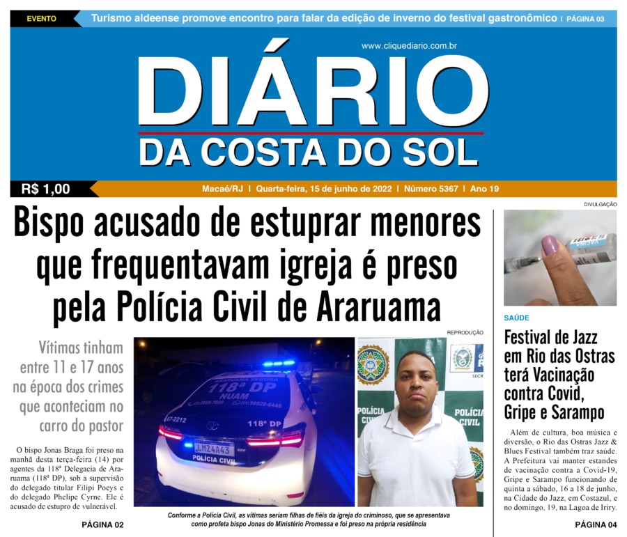 Edições Impressas Edição de quarta-feira 15/06/2022 nº 5367 Publicado em 14/06/2022 - 23:55 Escrito por Fernando Vitor Notícias relacionadas: Seguinte Edição de quinta a segunda-feira 16 a 20/06/2022 nº 5368 Anterior Edição de terça-feira 14/06/2022 nº 5366 Fernando Vitor Notícias Recentes Cultura1 hora atrás Moda e Prosa Caipira tem sua 6ª edição nessa quinta, 20, em Saquarema Comércio3 horas atrás Rio das Ostras tem 19ª edição de sua tradicional feira outlet nesse feriado Cidades3 horas atrás Macaé recebe 20ª edição do Prefeitura Presente no dia 25 de novembro Polícia4 horas atrás Denúncia anônima leva à prisão de duas mulheres por tráfico em Macaé Cidades4 horas atrás Caravana de Natal Coca-Cola passa por Rio das Ostras e Casimiro de Abreu nessa quinta, 20 Edições Impressas5 horas atrás Edição de quarta-feira 19/11/2025 nº 6215 Arraial do cabo21 horas atrás Educação de Arraial do Cabo orienta responsáveis sobre rematrícula para o próximo ano Cabo Frio21 horas atrás Evento comercial mais aguardado de Cabo Frio atinge 100% de estandes vendidos Saúde21 horas atrás Rio das Ostras comemora melhorias no atendimento da saúde municipal Cabo Frio22 horas atrás Nova exposição no Palácio das Águias recebe homenagem da cultura negra em Cabo Frio com 44 obras Clique Diário E. L. Mídia Editora Ltda CNPJ: 09.298.880/0001-07 Redação: Rua Tupinambás 122 Gloria – Macaé/RJ comercial@diariocs.com (22) 2765-7353 (22) 999253130 Mais lidas da semana Cultura5 dias atrás Adilson Lopes apresenta exposição “Trajetória” em Casimiro de Abreu Cidades2 dias atrás Macaé registra avanço na coleta seletiva porta a porta e recolhe mais de 2 toneladas em 45 dias Meio Ambiente2 dias atrás Lagoa de Iriry, em Rio das Ostras, recebe nova sinalização focada em sustentabilidade Mobilidade5 dias atrás Mobilidade promove fiscalização para verificar situação de táxis em Rio das Ostras