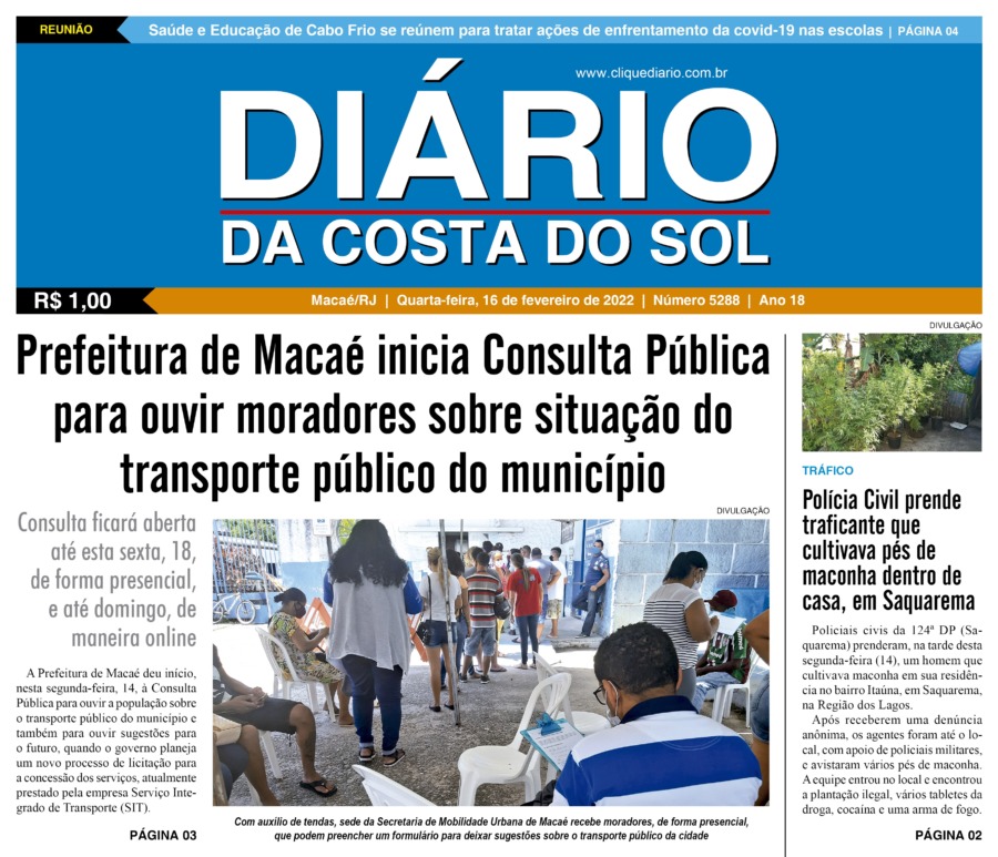 Edições Impressas Edição de quarta-feira, 16/02/2022 nº 5288 Publicado em 15/02/2022 - 23:55 Escrito por Fernando Vitor Notícias relacionadas: Seguinte Edição de quinta-feira 17/02/2022 nº 5289 Anterior Edição de terça-feira 15/02/2022 nº 5287 Fernando Vitor Notícias Recentes Edições Impressas4 horas atrás Edição de sábado a segunda-feira 08 a 10/11/2025 nº 6208 Polícia4 horas atrás Moto sem placa é abandonada após fuga de suspeito em Macaé Polícia5 horas atrás Polícia Civil prende homem em flagrante por tráfico de drogas no Parque Aeroporto, em Macaé Iguaba21 horas atrás Menina de Iguaba Grande realiza sonho e conhece o príncipe William no Rio de Janeiro Arraial do cabo21 horas atrás Arraial do Cabo é exemplo de tranquilidade na Região dos Lagos, segundo dados do ISP Arraial do cabo21 horas atrás Festival em Arraial do Cabo promete recorde de público com mais de 15 mil pratos e 10 mil litros de chope Arraial do cabo21 horas atrás Oficina une saúde, cidadania e acolhimento em Arraial do Cabo Arraial do cabo21 horas atrás Sucesso de público marca o primeiro dia da Arraial Expo XP Cabo Frio21 horas atrás Prefeitura de Cabo Frio premia autoras com experiências culturais e incentivo à leitura Cidades22 horas atrás Macaé realiza audiência pública do Projeto Macaé +20 no dia 10 de dezembro Clique Diário E. L. Mídia Editora Ltda CNPJ: 09.298.880/0001-07 Redação: Rua Tupinambás 122 Gloria – Macaé/RJ comercial@diariocs.com (22) 2765-7353 (22) 999253130 Mais lidas da semana Arraial do cabo2 dias atrás Arraial do Cabo celebra 3ª edição do Festival de Frutos do Mar com entrada livre; Carol Biazin, Ramona Rox, Liah Soares e mais Educação4 dias atrás Estudantes de Rio das Ostras são destaques em evento nacional da Educação Cidades4 dias atrás HFM ganha novo Pronto-Socorro moderno e ampliado em Campos Turismo5 dias atrás Saquarema celebra reconhecimento de projeto pelo Ministério do Turismo