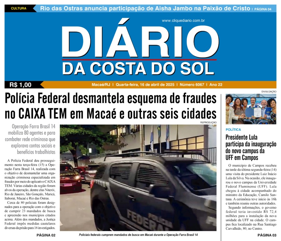Edições Impressas Edição de quarta-feira 16/04/2025 nº 6067 Publicado em 16/04/2025 - 08:43 Escrito por Redação Notícias relacionadas: Seguinte Edição de quinta-feira 17/04/2025 nº 6068 Anterior Edição de terça-feira 15/04/2025 nº 6066 Redação Notícias Recentes Cidades13 minutos atrás Ônibus Rosa oferece atendimentos de saúde na Praça Washington Luís nesta quarta e quinta em Macaé Cidades28 minutos atrás Contas da Prefeitura de Macaé dos anos de 2022 e 2023 são aprovadas por unanimidade na Câmara Cultura37 minutos atrás Orange Sound faz tributo ao Kid Abelha nessa quinta, 30, no Teatro de Rio das Ostras Cidades1 hora atrás Silva Jardim tem evento do Outubro Rosa nessa quinta, 30, no Teatro Cabo Frio4 horas atrás Cabo Frio: Lideranças da Guarda destacam união e compromisso dos agentes em Tamoios Segurança Pública4 horas atrás Maricá instala gabinete de crise preventivo depois de operação policial no Rio Cidades5 horas atrás Prefeito Bernard Tavares garante emenda de R$ 1 milhão para Carapebus em Brasília Cultura5 horas atrás Prédio da Onda, em Rio das Ostras, recebe oficina teatral gratuita a partir dessa quinta, 30 Polícia5 horas atrás Ex-vereadora de Campos é presa por injúria racial e confusão em agência dos Correios Cidades6 horas atrás Macaé marca presença na OTC Brasil e reforça papel estratégico no setor de energia Clique Diário E. L. Mídia Editora Ltda CNPJ: 09.298.880/0001-07 Redação: Rua Tupinambás 122 Gloria – Macaé/RJ comercial@diariocs.com (22) 2765-7353 (22) 999253130 Mais lidas da semana Edições Impressas4 dias atrás Edição de sábado a segunda-feira 25 a 27/10/2025 nº 6198 Cultura5 horas atrás Prédio da Onda, em Rio das Ostras, recebe oficina teatral gratuita a partir dessa quinta, 30 Edições Impressas5 dias atrás Edição de sexta-feira 24/10/2025 nº 6197 Cidadania5 dias atrás Plano Diretor de Rio das Ostras é tema de fórum da sociedade civil nesse sábado, 25