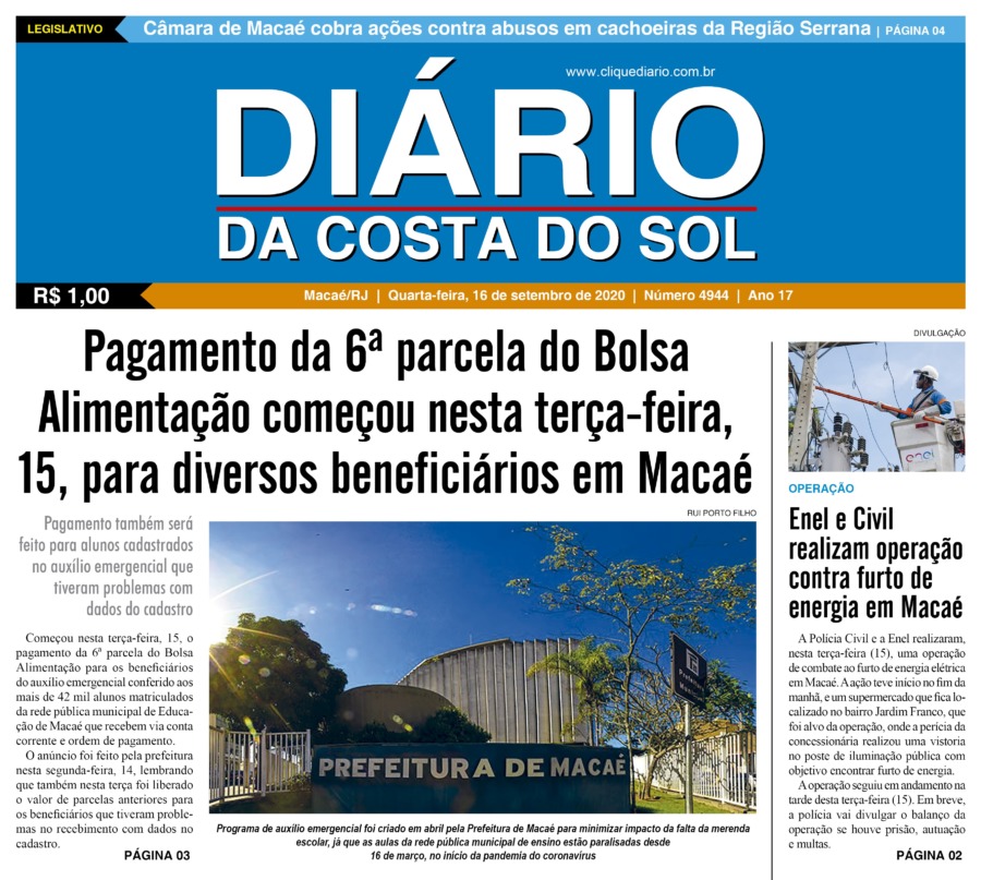 Edições Impressas Edição de quarta-feira 16/09/2020 nº 4944 Publicado em 16/09/2020 - 05:00 Escrito por Fernando Vitor Notícias relacionadas:destaque Seguinte Edição de quinta-feira 17/09/2020 nº 4945 Anterior Edição de terça-feira 15/09/2020 nº 4943 Fernando Vitor Notícias Recentes Cabo Frio7 horas atrás Arte e solidariedade marcam a 1ª Mostra de Dança Regional de Tamoios Cidades12 horas atrás Região serrana de Macaé recebe 1º X-Force Passeio de Quadriciclo e Aranha neste domingo (26) Polícia12 horas atrás Polícia apreende mais de meio quilo de drogas no Loteamento São João, em Rio das Ostras Saúde1 dia atrás Eventos esportivo e cultural reforça campanha do Outubro Rosa em Rio das Ostras nesse domingo, 26 Edições Impressas1 dia atrás Sábado a segunda-feira 25 a 27/10/2025 nº 6197 Cidades2 dias atrás Shopping Plaza Macaé oferece programação gratuita com feira de adoção e show de pagode neste fim de semana Cidades2 dias atrás 32º BPM completa 23 anos com solenidade de celebração e reconhecimento aos policiais Armação dos Búzios2 dias atrás Búzios celebra esporte e superação com XC RUN 2025 Araruama2 dias atrás Araruama promove saúde, lazer e cidadania em evento comunitário Arraial do cabo2 dias atrás Educação e sustentabilidade se encontram para jovens de Arraial do Cabo Clique Diário E. L. Mídia Editora Ltda CNPJ: 09.298.880/0001-07 Redação: Rua Tupinambás 122 Gloria – Macaé/RJ comercial@diariocs.com (22) 2765-7353 (22) 999253130 Mais lidas da semana Cultura6 dias atrás Silva Jardim anuncia shows gratuitos de samba e pagode para o fim de semana Cultura5 dias atrás Música, emoção e cores: Rodrigo Pontes apresenta show especial em Rio das Ostras Cabo Frio6 dias atrás Atletas de várias cidades se enfrentam em competição de Muay Thai em Cabo Frio Cabo Frio6 dias atrás Serviços essenciais permanecem ativos durante ponto facultativo em Cabo Frio