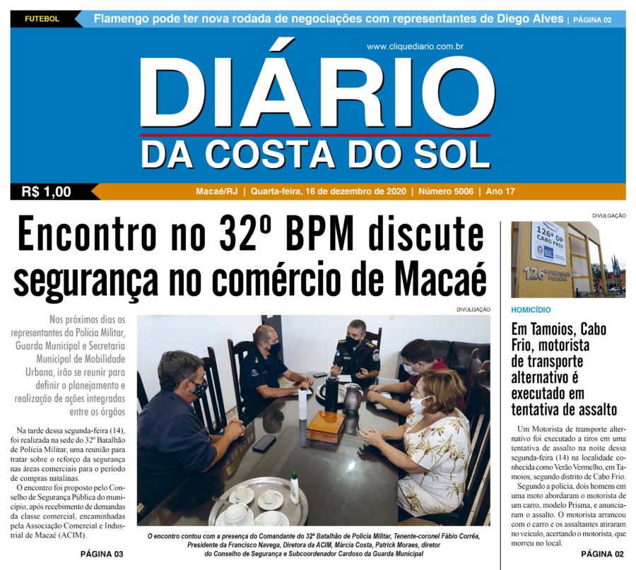 Edições Impressas Edição de quarta-feira 16/12/2020 nº 5006 Publicado em 16/12/2020 - 00:44 Escrito por Fernando Vitor Notícias relacionadas:destaque Seguinte Edição de quinta-feira 17/12/2020 nº 5007 Anterior Edição de terça-feira 15/12/2020 nº 5005 Fernando Vitor Notícias Recentes Cabo Frio1 dia atrás Estudantes de Cabo Frio brilham em premiação do projeto CaptaAção Meio Ambiente2 dias atrás Cepro promove encontro para discutir avanços e desafios da justiça climática em Rio das Ostras Armação dos Búzios2 dias atrás Búzios Swim celebra esporte, natureza e turismo na Região dos Lagos Cabo Frio2 dias atrás Educação pública de Cabo Frio colhe frutos com conquistas em competições científicas Edições Impressas2 dias atrás Edição de sábado a segunda-feira 08 a 10/11/2025 nº 6208 Polícia2 dias atrás Moto sem placa é abandonada após fuga de suspeito em Macaé Polícia2 dias atrás Polícia Civil prende homem em flagrante por tráfico de drogas no Parque Aeroporto, em Macaé Iguaba2 dias atrás Menina de Iguaba Grande realiza sonho e conhece o príncipe William no Rio de Janeiro Arraial do cabo2 dias atrás Arraial do Cabo é exemplo de tranquilidade na Região dos Lagos, segundo dados do ISP Arraial do cabo2 dias atrás Festival em Arraial do Cabo promete recorde de público com mais de 15 mil pratos e 10 mil litros de chope Clique Diário E. L. Mídia Editora Ltda CNPJ: 09.298.880/0001-07 Redação: Rua Tupinambás 122 Gloria – Macaé/RJ comercial@diariocs.com (22) 2765-7353 (22) 999253130 Mais lidas da semana Arraial do cabo4 dias atrás Arraial do Cabo celebra 3ª edição do Festival de Frutos do Mar com entrada livre; Carol Biazin, Ramona Rox, Liah Soares e mais Meio Ambiente4 dias atrás Programa do governo estadual promove limpeza de rio no Âncora, em Rio das Ostras Meio Ambiente3 dias atrás Ações do Programa Limpa Rio seguem em vários pontos de Rio das Ostras Cidades5 dias atrás HFM ganha novo Pronto-Socorro moderno e ampliado em Campos