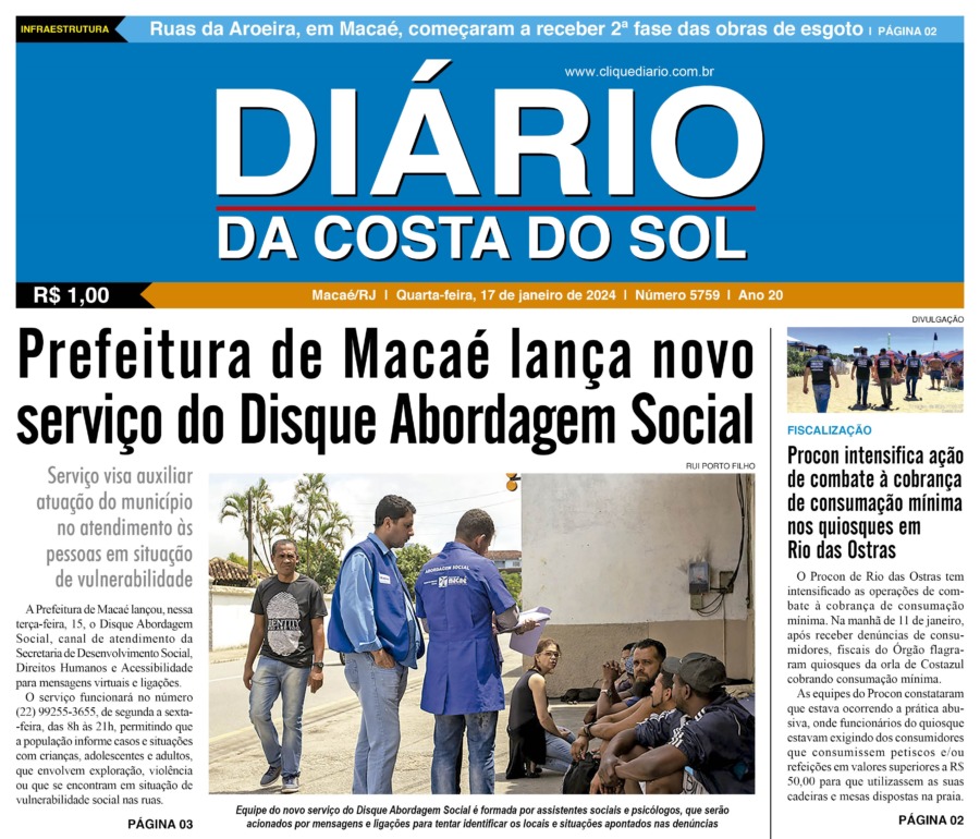Edições Impressas Edição de quarta-feira 17/01/2024 nº 5759 Publicado em 17/01/2024 - 00:00 Escrito por Redação Notícias relacionadas: Seguinte Edição de quinta-feira 18/01/2024 nº 5760 Anterior Edição de terça-feira 16/01/2024 nº 5758 Redação Notícias Recentes Cabo Frio10 horas atrás Arte e solidariedade marcam a 1ª Mostra de Dança Regional de Tamoios Cidades15 horas atrás Região serrana de Macaé recebe 1º X-Force Passeio de Quadriciclo e Aranha neste domingo (26) Polícia15 horas atrás Polícia apreende mais de meio quilo de drogas no Loteamento São João, em Rio das Ostras Saúde1 dia atrás Eventos esportivo e cultural reforça campanha do Outubro Rosa em Rio das Ostras nesse domingo, 26 Edições Impressas2 dias atrás Sábado a segunda-feira 25 a 27/10/2025 nº 6197 Cidades2 dias atrás Shopping Plaza Macaé oferece programação gratuita com feira de adoção e show de pagode neste fim de semana Cidades2 dias atrás 32º BPM completa 23 anos com solenidade de celebração e reconhecimento aos policiais Armação dos Búzios2 dias atrás Búzios celebra esporte e superação com XC RUN 2025 Araruama2 dias atrás Araruama promove saúde, lazer e cidadania em evento comunitário Arraial do cabo2 dias atrás Educação e sustentabilidade se encontram para jovens de Arraial do Cabo Clique Diário E. L. Mídia Editora Ltda CNPJ: 09.298.880/0001-07 Redação: Rua Tupinambás 122 Gloria – Macaé/RJ comercial@diariocs.com (22) 2765-7353 (22) 999253130 Mais lidas da semana Cultura6 dias atrás Silva Jardim anuncia shows gratuitos de samba e pagode para o fim de semana Cultura6 dias atrás Música, emoção e cores: Rodrigo Pontes apresenta show especial em Rio das Ostras Cabo Frio6 dias atrás Atletas de várias cidades se enfrentam em competição de Muay Thai em Cabo Frio Cabo Frio6 dias atrás Serviços essenciais permanecem ativos durante ponto facultativo em Cabo Frio