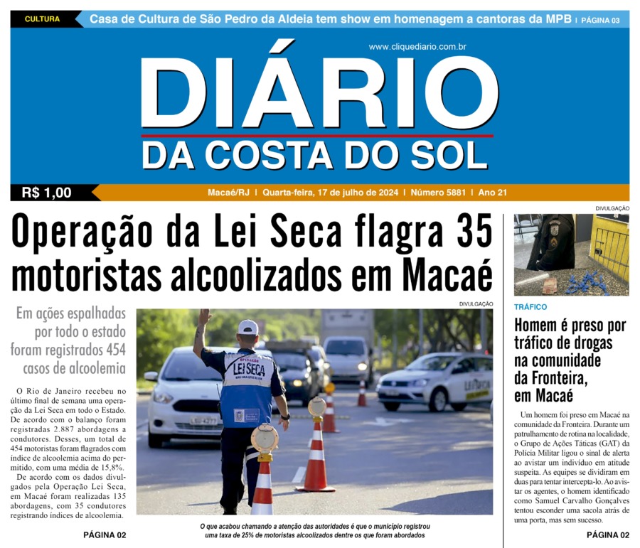 Edições Impressas Edição de quarta-feira 17/07/2024 nº 5881 Publicado em 17/07/2024 - 00:00 Escrito por Redação Notícias relacionadas: Seguinte Edição de quinta-feira 18/07/2024 nº 5882 Anterior Edição de terça-feira 16/07/2024 nº 5880 Redação Notícias Recentes Cabo Frio19 horas atrás Estudantes de Cabo Frio brilham em premiação do projeto CaptaAção Armação dos Búzios1 dia atrás Búzios Swim celebra esporte, natureza e turismo na Região dos Lagos Cabo Frio1 dia atrás Educação pública de Cabo Frio colhe frutos com conquistas em competições científicas Edições Impressas1 dia atrás Edição de sábado a segunda-feira 08 a 10/11/2025 nº 6208 Polícia1 dia atrás Moto sem placa é abandonada após fuga de suspeito em Macaé Polícia1 dia atrás Polícia Civil prende homem em flagrante por tráfico de drogas no Parque Aeroporto, em Macaé Iguaba2 dias atrás Menina de Iguaba Grande realiza sonho e conhece o príncipe William no Rio de Janeiro Arraial do cabo2 dias atrás Arraial do Cabo é exemplo de tranquilidade na Região dos Lagos, segundo dados do ISP Arraial do cabo2 dias atrás Festival em Arraial do Cabo promete recorde de público com mais de 15 mil pratos e 10 mil litros de chope Arraial do cabo2 dias atrás Oficina une saúde, cidadania e acolhimento em Arraial do Cabo Clique Diário E. L. Mídia Editora Ltda CNPJ: 09.298.880/0001-07 Redação: Rua Tupinambás 122 Gloria – Macaé/RJ comercial@diariocs.com (22) 2765-7353 (22) 999253130 Mais lidas da semana Arraial do cabo3 dias atrás Arraial do Cabo celebra 3ª edição do Festival de Frutos do Mar com entrada livre; Carol Biazin, Ramona Rox, Liah Soares e mais Meio Ambiente4 dias atrás Programa do governo estadual promove limpeza de rio no Âncora, em Rio das Ostras Meio Ambiente3 dias atrás Ações do Programa Limpa Rio seguem em vários pontos de Rio das Ostras Turismo6 dias atrás Saquarema celebra reconhecimento de projeto pelo Ministério do Turismo