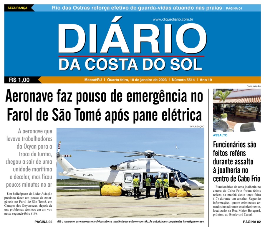 Edições Impressas Edição de quarta-feira 18/01/2023 nº 5514 Publicado em 18/01/2023 - 00:00 Escrito por Redação Notícias relacionadas: Seguinte Edição de quinta-feira 19/01/2023 nº 5515 Anterior Edição de terça-feira 17/01/2023 nº 5513 Redação Notícias Recentes Cabo Frio18 horas atrás Arte e solidariedade marcam a 1ª Mostra de Dança Regional de Tamoios Cidades23 horas atrás Região serrana de Macaé recebe 1º X-Force Passeio de Quadriciclo e Aranha neste domingo (26) Polícia23 horas atrás Polícia apreende mais de meio quilo de drogas no Loteamento São João, em Rio das Ostras Saúde2 dias atrás Eventos esportivo e cultural reforça campanha do Outubro Rosa em Rio das Ostras nesse domingo, 26 Edições Impressas2 dias atrás Sábado a segunda-feira 25 a 27/10/2025 nº 6197 Cidades2 dias atrás Shopping Plaza Macaé oferece programação gratuita com feira de adoção e show de pagode neste fim de semana Cidades3 dias atrás 32º BPM completa 23 anos com solenidade de celebração e reconhecimento aos policiais Armação dos Búzios3 dias atrás Búzios celebra esporte e superação com XC RUN 2025 Araruama3 dias atrás Araruama promove saúde, lazer e cidadania em evento comunitário Arraial do cabo3 dias atrás Educação e sustentabilidade se encontram para jovens de Arraial do Cabo Clique Diário E. L. Mídia Editora Ltda CNPJ: 09.298.880/0001-07 Redação: Rua Tupinambás 122 Gloria – Macaé/RJ comercial@diariocs.com (22) 2765-7353 (22) 999253130 Mais lidas da semana Cultura7 dias atrás Silva Jardim anuncia shows gratuitos de samba e pagode para o fim de semana Cultura6 dias atrás Música, emoção e cores: Rodrigo Pontes apresenta show especial em Rio das Ostras Polícia7 dias atrás Policiais da PRF salvam bebê engasgado na BR-101, em Campos Cabo Frio7 dias atrás Atletas de várias cidades se enfrentam em competição de Muay Thai em Cabo Frio