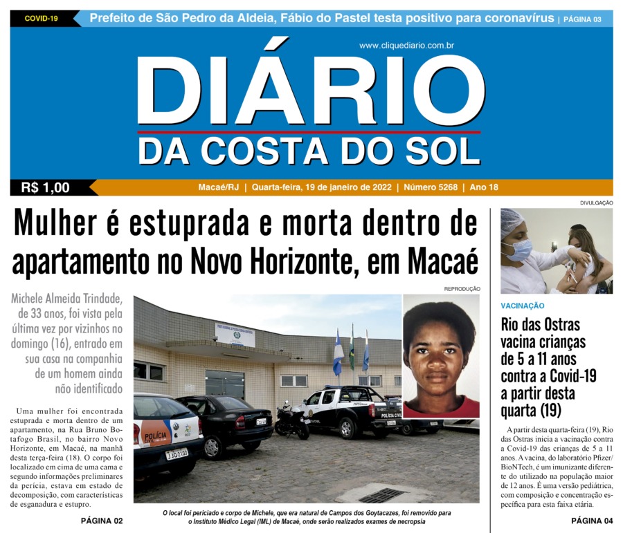 Edições Impressas Edição de quarta-feira 19/01/2022 nº 5268 Publicado em 18/01/2022 - 23:58 Escrito por Fernando Vitor Notícias relacionadas: Seguinte Edição de quinta-feira 20/01/2022 nº 5269 Anterior Edição de terça-feira 18/01/2022 nº 5267 Fernando Vitor Notícias Recentes Infraestrutura1 hora atrás Obras de construção do Complexo Educacional de Jaconé avançam em Saquarema Cidades2 horas atrás Prefeitura promete apurar condições de trabalho de homem que morreu ao cair de escada em Rio das Ostras Cidades2 horas atrás Silva Jardim promove Edição Novembro Azul da Feira de Agricultura Familiar Cidades2 horas atrás Procon de Campos emite orientações para compras seguras na Black Friday Cidades3 horas atrás Macaé abre programação do Natal Magia com grande público na Praia Campista Polícia3 horas atrás Trio é preso por tráfico de drogas durante operação da Polícia Civil em Macaé Cidades3 horas atrás Ação da prefeitura leva serviços para moradores do Mar do Norte, em Rio das Ostras Edições Impressas4 horas atrás Edição de sexta-feira 28/11/2025 nº 6221 Arraial do cabo20 horas atrás Arraial do Cabo atualiza protocolos e fortalece acolhimento às gestantes Arraial do cabo20 horas atrás Arraial do Cabo executa obra de proteção e projeta área de lazer em Monte Alto Clique Diário E. L. Mídia Editora Ltda CNPJ: 09.298.880/0001-07 Redação: Rua Tupinambás 122 Gloria – Macaé/RJ comercial@diariocs.com (22) 2765-7353 (22) 999253130 Mais lidas da semana Polícia1 dia atrás Homem é preso com drogas em ação da PM no Âncora, em Rio das Ostras Cabo Frio2 dias atrás Cabo Frio: Guarda Municipal comemora 65 anos com estrutura reforçada Saúde3 dias atrás Rio das Ostras amplia vacinação contra HPV até dezembro para jovens até 19 anos Sem categoria3 dias atrás Arraial do Cabo inicia operação para padronizar quadriciclos e similares
