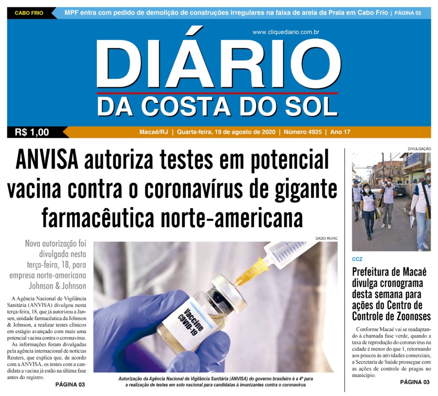 Edições Impressas Edição de quarta-feira 19/08/2020 nº 4925 Publicado em 19/08/2020 - 05:00 Escrito por Fernando Vitor Notícias relacionadas: Seguinte Edição de quinta-feira 20/08/2020 nº 4926 Anterior Edição de terça-feira 18/08/2020 nº 4924 Fernando Vitor Notícias Recentes Cabo Frio12 horas atrás Arte e solidariedade marcam a 1ª Mostra de Dança Regional de Tamoios Cidades18 horas atrás Região serrana de Macaé recebe 1º X-Force Passeio de Quadriciclo e Aranha neste domingo (26) Polícia18 horas atrás Polícia apreende mais de meio quilo de drogas no Loteamento São João, em Rio das Ostras Saúde2 dias atrás Eventos esportivo e cultural reforça campanha do Outubro Rosa em Rio das Ostras nesse domingo, 26 Edições Impressas2 dias atrás Sábado a segunda-feira 25 a 27/10/2025 nº 6197 Cidades2 dias atrás Shopping Plaza Macaé oferece programação gratuita com feira de adoção e show de pagode neste fim de semana Cidades2 dias atrás 32º BPM completa 23 anos com solenidade de celebração e reconhecimento aos policiais Armação dos Búzios2 dias atrás Búzios celebra esporte e superação com XC RUN 2025 Araruama2 dias atrás Araruama promove saúde, lazer e cidadania em evento comunitário Arraial do cabo2 dias atrás Educação e sustentabilidade se encontram para jovens de Arraial do Cabo Clique Diário E. L. Mídia Editora Ltda CNPJ: 09.298.880/0001-07 Redação: Rua Tupinambás 122 Gloria – Macaé/RJ comercial@diariocs.com (22) 2765-7353 (22) 999253130 Mais lidas da semana Cultura6 dias atrás Silva Jardim anuncia shows gratuitos de samba e pagode para o fim de semana Cultura6 dias atrás Música, emoção e cores: Rodrigo Pontes apresenta show especial em Rio das Ostras Cabo Frio6 dias atrás Atletas de várias cidades se enfrentam em competição de Muay Thai em Cabo Frio Cabo Frio6 dias atrás Serviços essenciais permanecem ativos durante ponto facultativo em Cabo Frio